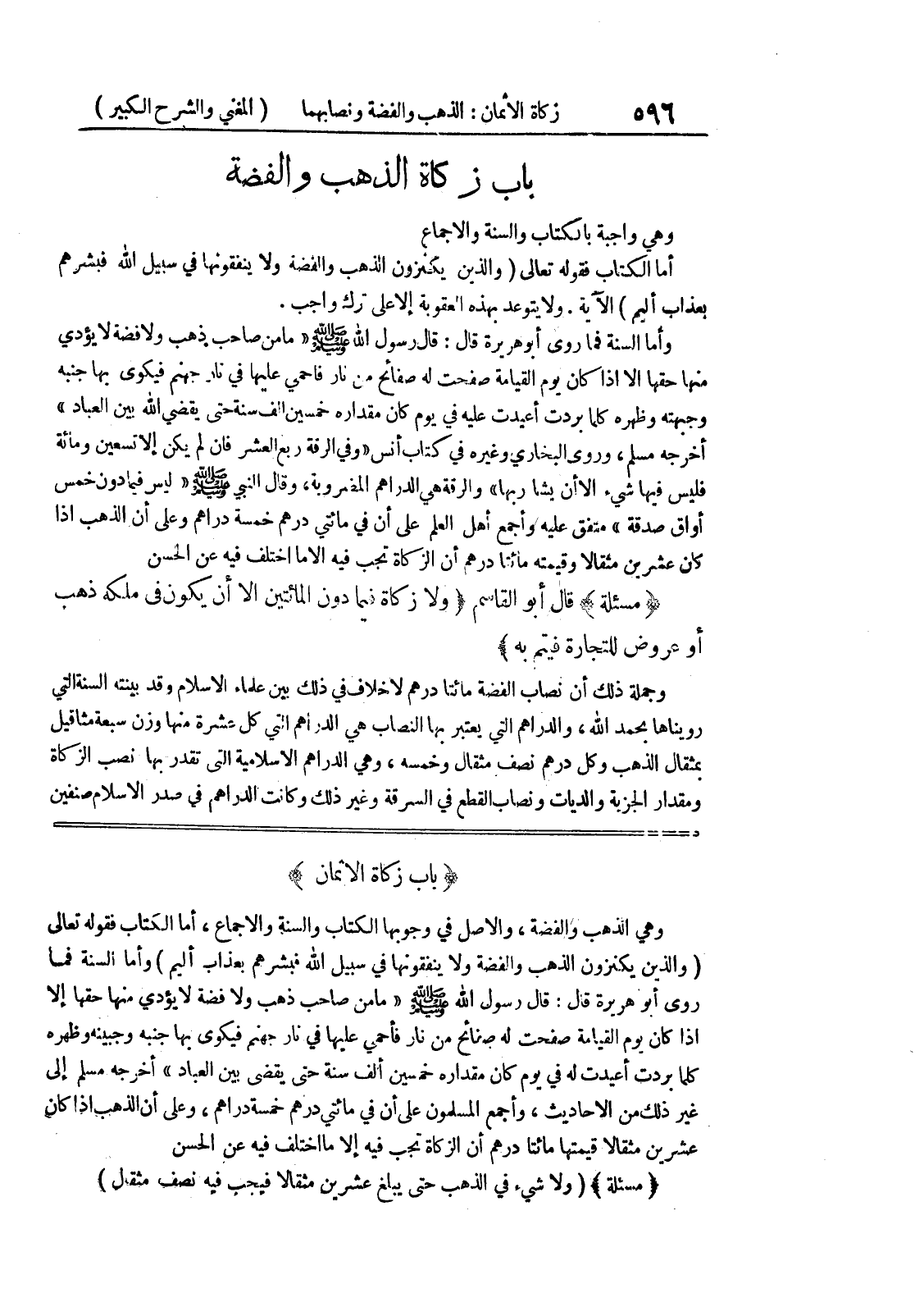 * (باب زكاة الاثمان) * وهي الذهب والفضة، والأصل في وجوبها الكتاب والسنة والإجماع، أما الكتاب فقوله تعالى (والذين يكنزون الذهب والفضة ولا ينفقونها في سبيل الله فبشرهم بعذاب أليم) وأما السنة فما روى أبو هريرة قال: قال رسول الله صلى الله عليه وسلم " ما من صاحب ذهب ولا فضة لا يؤدي منها حقها إلا إذا كان يوم القيامة صفحت له صفائح من نار فأحمي عليها في نار جهنم فيكوى بها جنبه وجبينه وظهره كلما بردت أعيدت له في يوم كان مقداره خمسين ألف سنة حتى يقضى بين العباد " أخرجه مسلم إلى غير ذلك من الاحاديث، وأجمع المسلمون على أن في مائتي درهم خمسة دراهم، وعلى أن الذهب اذا كان عشرين مثقالا قيمتها مائتا درهم أن الزكاة تجب فيه إلا ما اختلف فيه عن الحسن * (مسألة) * (ولا شئ في الذهب حتى يبلغ عشرين مثقالا فيجب فيه نصف مثقال)
