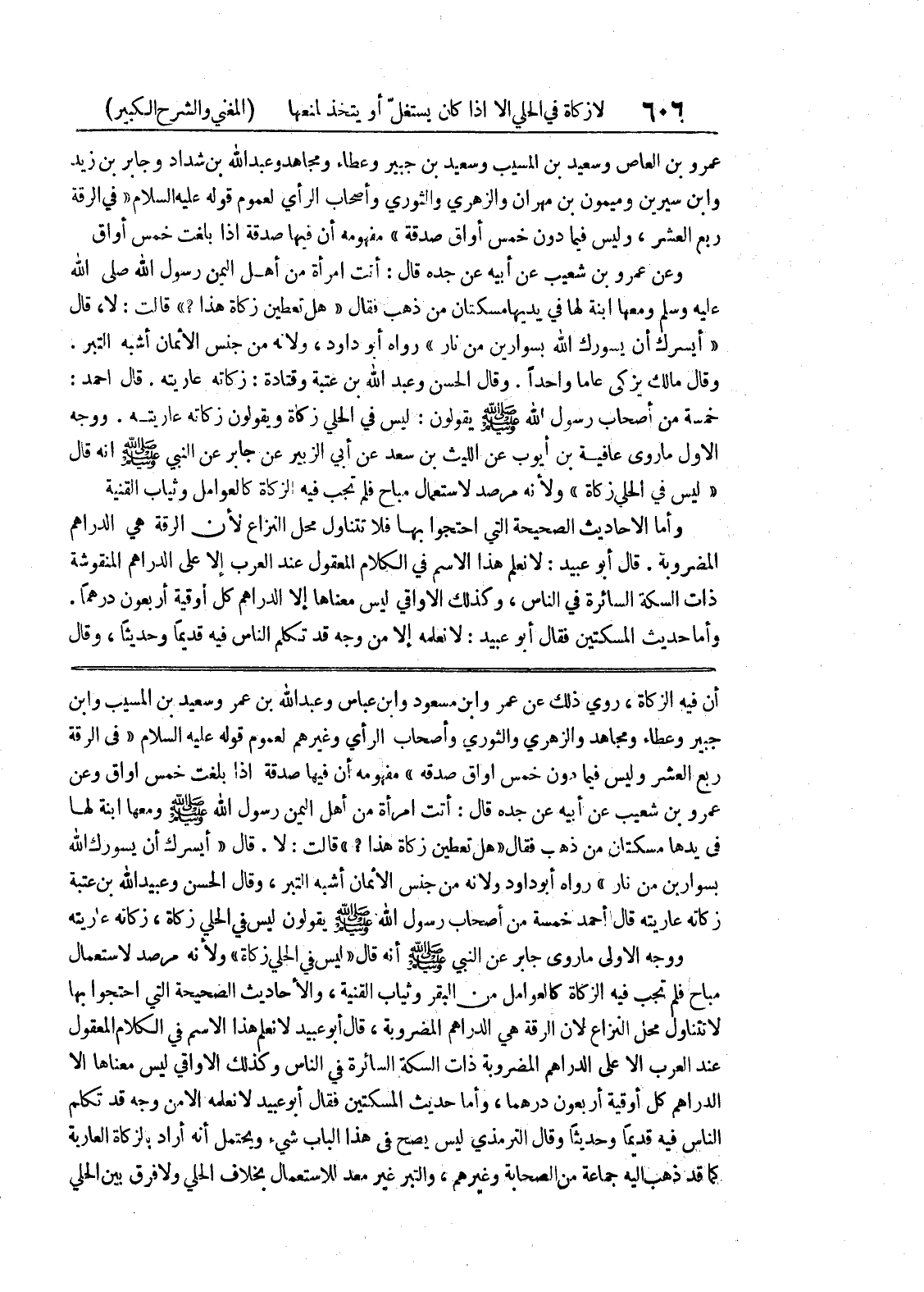 قال " أيسرك أن يسورك الله بسوارين من نار " رواه أبو داود ولأنه من جنس الأثمان أشبه التبر، وقال الحسن وعبيد الله بن عتبة زكاته عاريته قال أحمد خمسة من أصحاب رسول الله صلى الله عليه وسلم يقولون ليس في الحلي زكاة، زكاته عاريته ووجه الأولى ما روى جابر عن النبي صلى الله عليه وسلم أنه قال " ليس في الحلي زكاة " ولأنه مرصد لاستعمال مباح فلم تجب فيه الزكاة كالعوامل من البقر وثياب القنية، والأحاديث الصحيحة التي احتجوا بها لا تتناول محل النزاع لأن الرقة هي الدراهم المضروبة، قال أبو عبيد لا نعلم هذا الاسم في الكلام المعقول عند العرب الا على الدراهم المضروبة ذات السكة السائرة في الناس وكذلك الاواقي ليس معناها الا الدراهم كل أوقية أربعون درهما، وأما حديث المسكتين فقال أبو عبيد لا نعلمه الا من وجه قد تكلم
