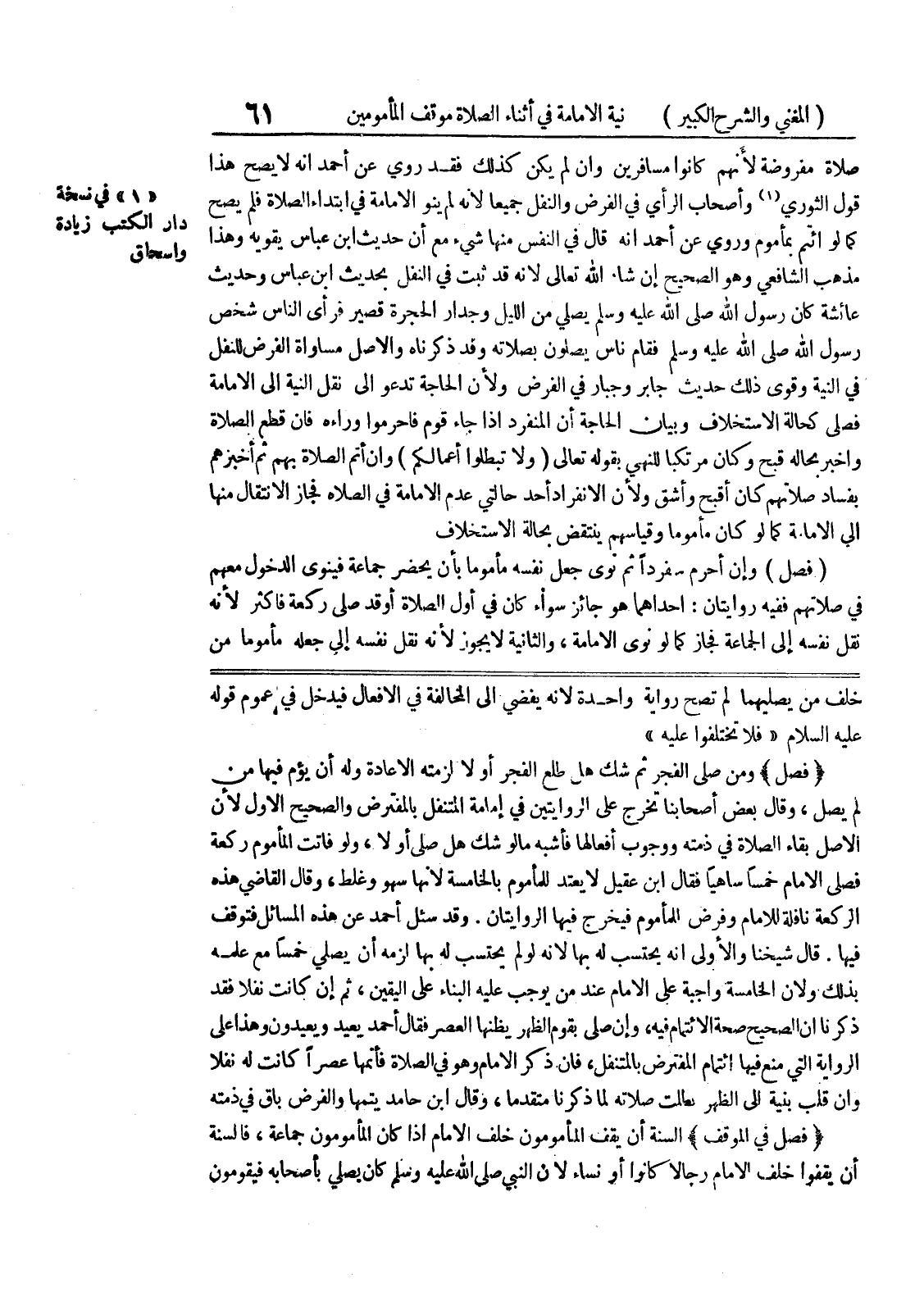 خلف من يصليهما لم تصح رواية واحدة لأنه يفضي إلى المخالفة في الأفعال فيدخل في عموم قوله عليه السلام " فلا تختلفوا عليه " * (فصل) * ومن صلى الفجر ثم شك هل طلع الفجر أو لا لزمته الاعادة وله أن يؤم فيها من لم يصل، وقال بعض أصحابنا تخرج على الروايتين في إمامة المتنفل بالمفترض والصحيح الأول لأن الأصل بقاء الصلاة في ذمته ووجوب أفعالها فأشبه ما لو شك هل صلى أو لا، ولو فاتت المأموم ركعة فصلى الامام خمساً ساهياً فقال ابن عقيل لا يعتد للمأموم بالخامسة لأنها سهو وغلط، وقال القاضي هذه الركعة نافله للإمام وفرض للمأموم فيخرج فيها الروايتان.