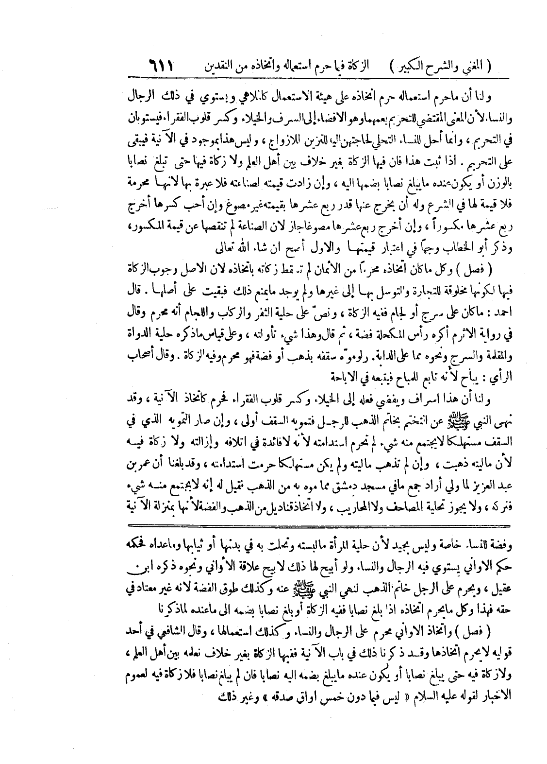 وفضة للنساء خاصة وليس بجيد لأن حلية المرأة ما لبسته وتحلت به في بدنها أو ثيابها وما عداه فحكمه حكم الاواني يستوي فيه الرجال والنساء ولو أبيح لها ذلك لأبيح علاقة الأواني ونحوه ذكره ابن عقيل، ويحرم على الرجل خاتم الذهب لنهي النبي صلى الله عليه وسلم عنه وكذلك طوق الفضة لأنه غير معتاد في حقه فهذا وكل ما يحرم اتخاذه اذا بلغ نصابا ففيه الزكاة أو بلغ نصابا بضمه الى ما عنده لما ذكرنا (فصل) واتخاذ الأواني محرم على الرجال والنساء وكذلك استعمالها، وقال الشافعي في أحد قوليه لا يحرم اتخاذها وقد ذكرنا ذلك في باب الآنية ففيها الزكاة بغير خلاف نعلمه بين أهل العلم، ولا زكاة فيه حتى يبلغ نصابا أو يكون عنده ما يبلغ بضمه اليه نصابا فإن لم يبلغ نصاباً فلا زكاة فيه لمعوم
