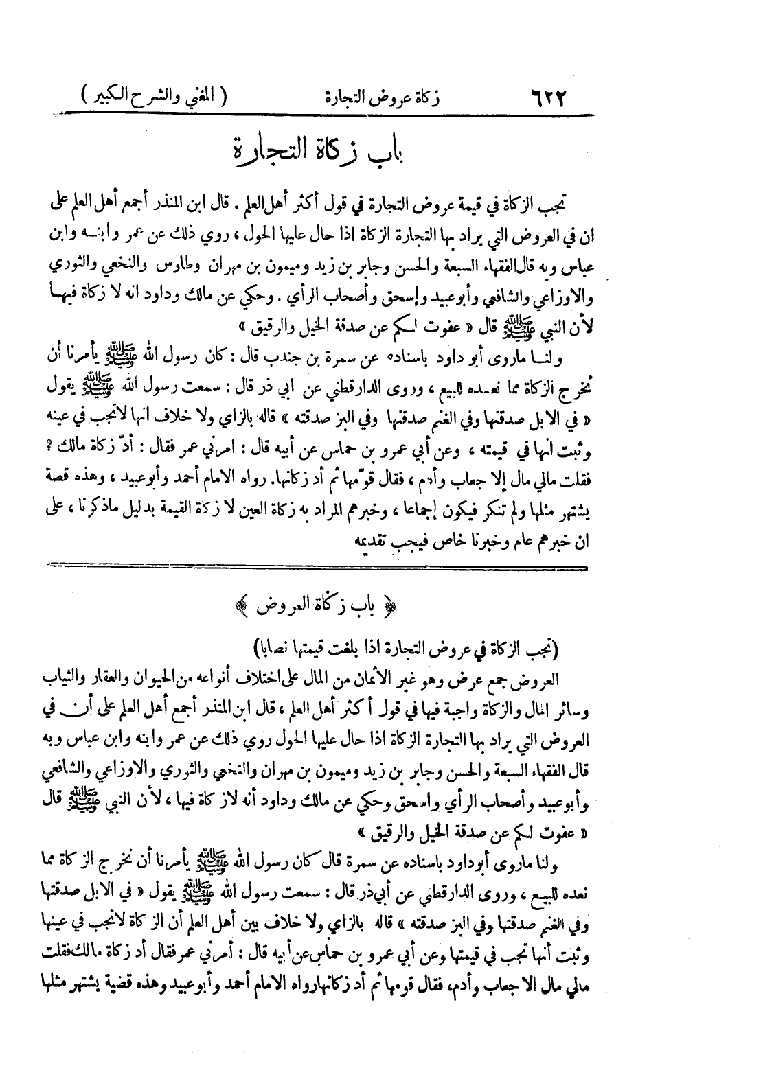 * (باب زكاة العروض) * (تجب الزكاة في عروض التجارة إذا بلغت قيمتها نصاباً) العروض جمع عرض وهو غير الاثمان من المال على اختلاف أنواعه من الحيوان والعقار والثياب وسائر المال والزكاة واجبة فيها في قول أكثر أهل العلم، قال ابن المنذر أجمع أهل العلم على أن في العروض التي يراد بها التجارة الزكاة إذا حال عليها الحول روى ذلك عن عمر وابنه وابن عباس وبه قال الفقهاء السبعة والحسن وجابر بن زيد وميمون بن مهران والنخعي والثوري والاوزاعي والشافعي وأبو عبيد وأصحاب الرأي واسحق وحكي عن مالك وداود أنه لا زكاة فيها، لأن النبي صلى الله عليه وسلم قال " عفوت لكم عن صدقة الخيل والرقيق " ولنا ما روى أبو داود بإسناده عن سمرة قال كان رسول الله صلى الله عليه وسلم يأمرنا أن نخرج الزكاة مما نعده للبيع، وروى الدارقطني عن أبي ذر قال: سمعت رسول الله صلى الله عليه وسلم يقول " في الابل صدقتها وفي الغنم صدقتها وفي البز صدقته " قاله بالزاي ولا خلاف بين أهل العلم أن الزكاة لا تجب في عينها وثبت أنها تجب في قيمتها وعن ابي عمرو بن حماس عن أبيه قال: أمرني عمر فقال أد زكاة مالك فقلت مالي مال الا جعاب وأدم، فقال قومها ثم أد زكاتها رواه الإمام أحمد وأبو عبيد وهذه قضية يشتهر مثلها