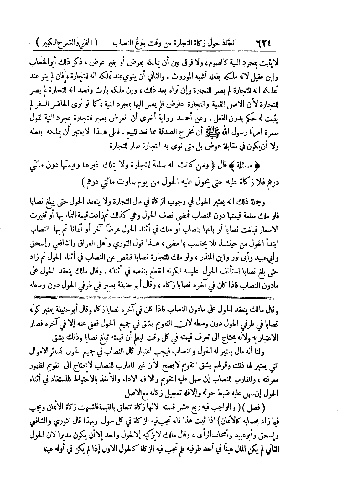 وقال مالك ينعقد الحول على ما دون النصاب فإذا كان في آخره نصابا زكاه وقال أبو حنيفة يعتبر كونه نصابا في طرفي الحول دون وسطه لان التقويم يشق في جميع الحول فعفى عنه إلا في آخره فصار الاعتبار به ولانه يحتاج إلى تعرف قيمته في كل وقت ليعلم أن قيمته تبلغ نصابا وذلك يشق ولنا أنه مال يعتبر له الحول والنصاب فيجب اعتبار كمال النصاب في جميع الحول كسائر الاموال التي يعتبر لها ذلك وقولهم يشق التقويم لا يصح لأن غير المقارب للنصاب لا يحتاج إلى تقويم لظهور معرفته، والمقارب للنصاب إن سهل عليه التقويم والا فله الاداء والأخذ بالاحتياط كالمستفاد في أثناء الحول إن سهل على ضبط حوله وإلا فله تعجيل زكاته مع الاصل (فصل) (والواجب فيه ربع عشر قيمته لأنها زكاة تتعلق بالقيمة فاشبهت زكاة الاثمان ويجب فيما زاد بحسابه كالأثمان) إذا ثبت هذا فإنه تجب فيه الزكاة في كل حول وبهذا قال الثوري والشافعي وإسحق وأبو عبيد وأصحاب الرأي، وقال مالك لا يزكيه إلا لحول واحد إلا أن يكون مدبراً لان الحول الثاني لم يكن المال عيناً في أحد طرفيه فلم تجب فيه الزكاة كالحول الاول إذا لم يكن في أوله عيناً