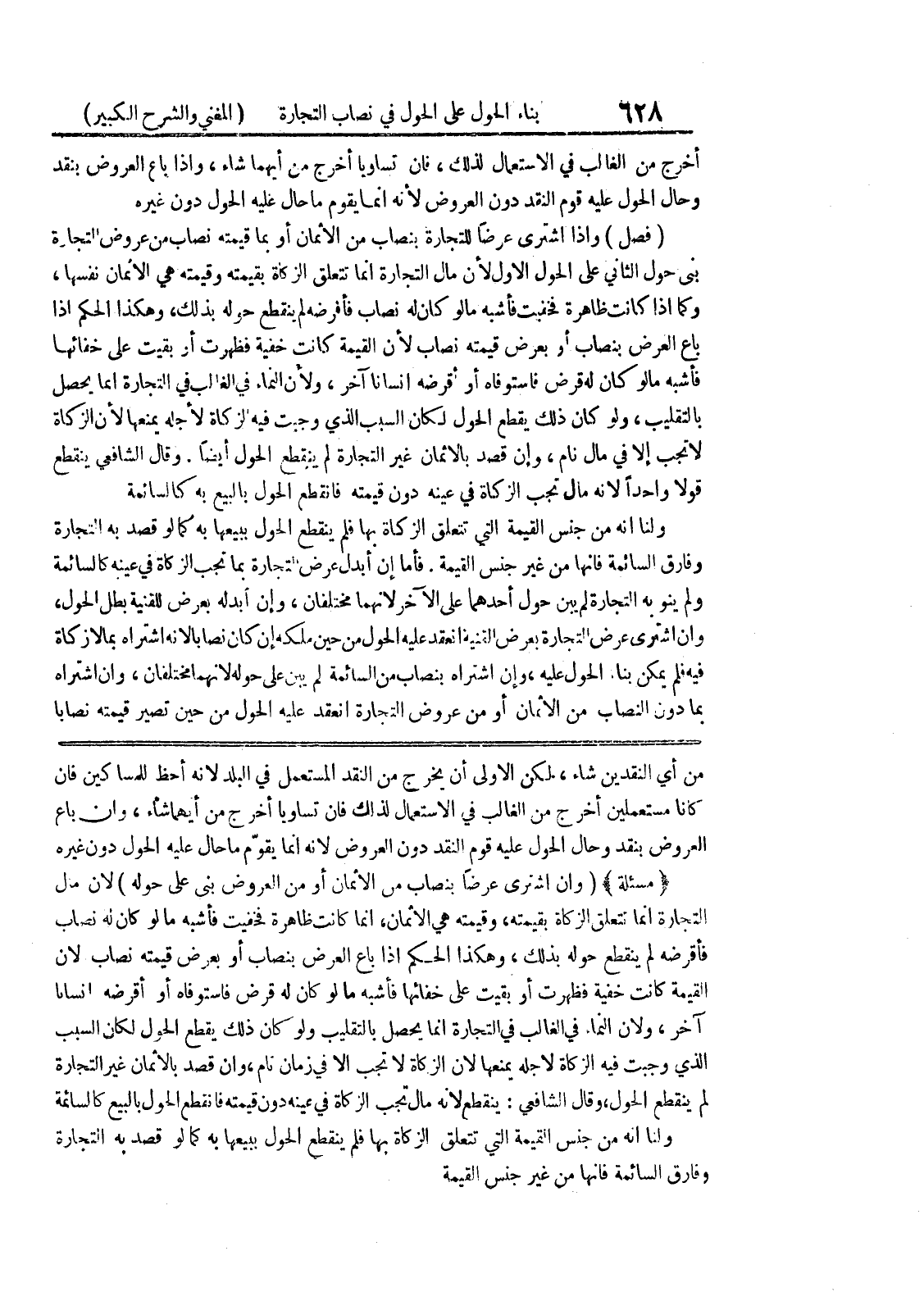 من أي النقدين شاء، لكن الاولى أن يخرج من النقد المستعمل في البلد لأنه أحظ للمساكين فان كانا مستعملين أخرج من الغالب في الاستعمال لذلك فان تساويا أخرج من أيهما شاء، وان باع العروض بنقد وحال الحول عليه قوم النقد دون العروض لانه انما يقوم ما حال عليه الحول دون غيره * (مسألة) * (وإن اشترى عرضاً بنصاب من الأثمان أو من العروض بنى على حوله) لأن مال التجارة انما تتعلق الزكاة بقيمته، وقيمته هي الاثمان، انما كانت ظاهرة فخفيت فأشبه ما لو كان له نصاب فأقرضه لم ينقطع حوله بذلك، وهكذا الحكم إذا باع العرض بنصاب أو بعرض قيمته نصاب لان القيمة كانت خفية فظهرت أو بقيت على خفائها فأشبه ما لو كان له قرض فاستوفاه أو أقرضه انساناً آخر، ولان النماء في الغالب في التجارة إنما يحصل بالتقليب ولو كان ذلك يقطع الحول لكان السبب
