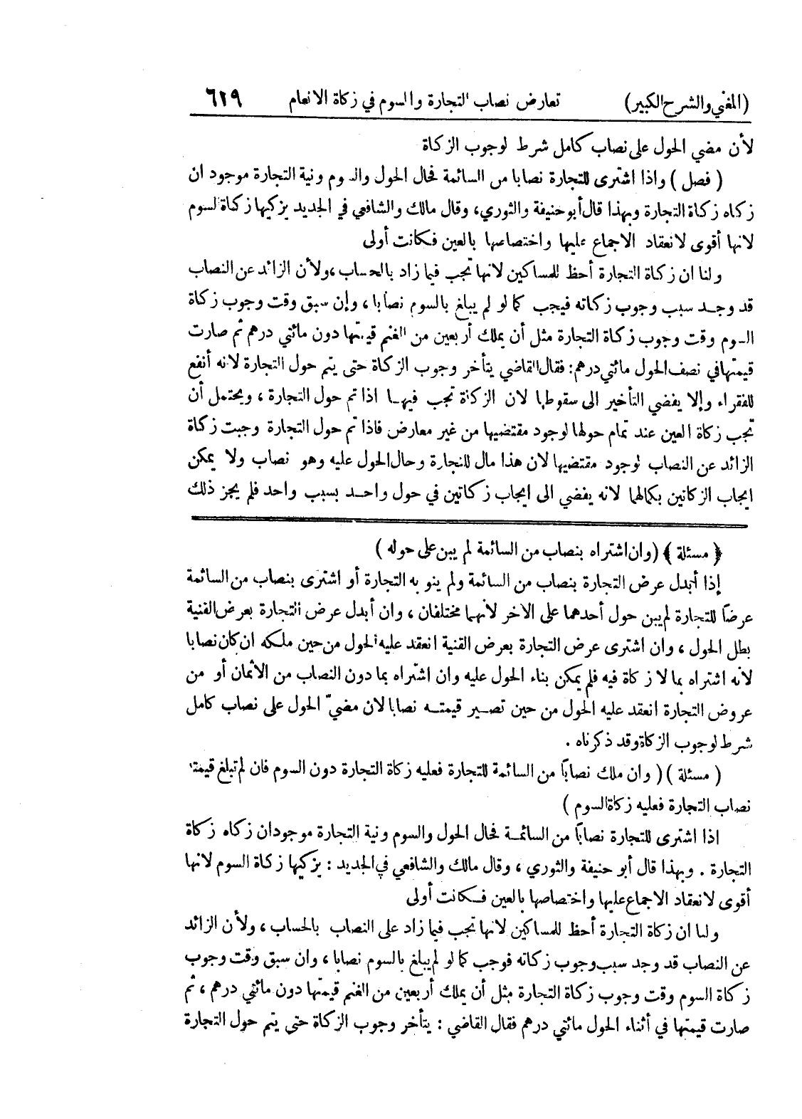 وبهذا قال أبو حنيفة والثوري، وقال مالك والشافعي في الجديد: يزكيها زكاة السوم لانها أقوى لانعقاد الاجماع عليها واختصاصها بالعين فكانت أولى ولنا أن زكاة التجارة أحظ للمساكين لانها تجب فيما زاد على النصاب بالحساب، ولأن الزائد عن النصاب قد وجد سبب وجوب زكاته فوجب كما لو لم يبلغ بالسوم نصابا، وان سبق وقت وجوب زكاة السوم وقت وجوب زكاة التجارة مثل أن يملك أربعين من الغنم قيمتها دون مائتي درهم، ثم صارت فيمتها في أثناء الحول مائتي درهم فقال القاضي: يتأخر وجوب الزكاة حتى يتم حول التجارة