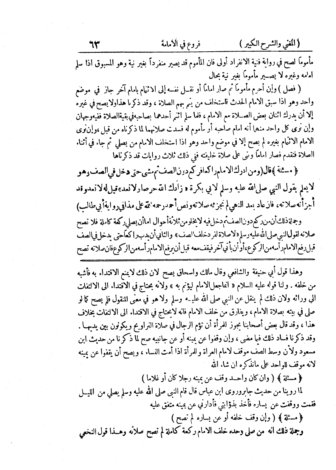 وقد ذكرنا فساد ذلك فيما مضى، وإن وقفوا عن يمينه أو عن جانبيه صح لما ذكرنا من حديث ابن مسعود ولأن وسط الصف موقف لإمام العراة وللمرأة اذا أمت النساء، ويصح أن يقفوا عن يمينه لأنه موقف للواحد على ما نذكره إن شاء الله * (مسألة) * (وإن كان واحد وقف عن يمينه رجلا كان أو غلاماً) لما روينا من حديث جابر وروى ابن عباس قال قام النبي صلى الله عليه وسلم يصلي من الليل فقمت ووقفت عن يساره فأخذ بذؤابتي فأدارني عن يمينه متفق عليه * (مسألة) * (وإن وقف خلفه أو عن يساره لم تصح) وجملة ذلك أنه من صلى وحده خلف الامام ركعة كاملة لم تصح صلاته وهذا قول النخعي