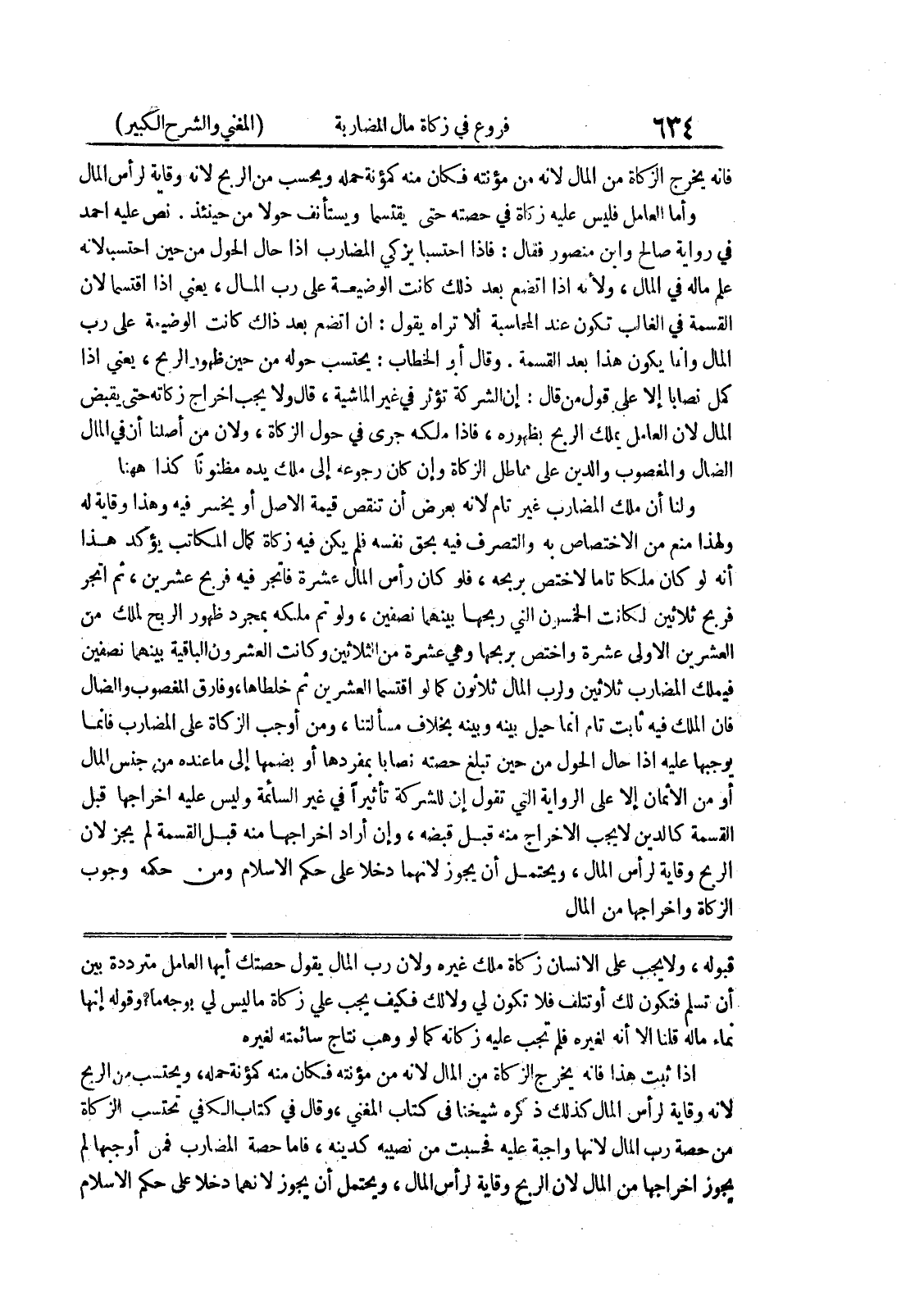 قبوله، ولا يجب على الانسان زكاة ملك غيره ولأن رب المال يقول حصتك أيها العامل مترددة بين أن تسلم فتكون لك أو تتلف فلا تكون لي ولا لك فكيف يجب علي زكاة ما ليس لي بوجه ما؟ وقوله إنها نماء ماله فلنا إلا أنه لغيره فلم تجب عليه زكاته كما لو وهب نتاج سائمته لغيره إذا ثبت هذا فإنه يخرج الزكاة من المال لانه من مؤنته فكان منه كمؤنة حمله، ويحتسب من الربح لأنه وقاية لرأس المال كذلك ذكره شيخنا في كتاب المغني، وقال في كتاب تحتسب الزكاة من حصة رب المال لأنها واجبة عليه فحسبت من نصيبه كدينه، فاما حصة المضارب فمن أوجبها لم يجوز اخراجها من المال لأن الربح وقاية لرأس المال، ويحتمل أن يجوز لأنهما دخلا على حكم الاسلام