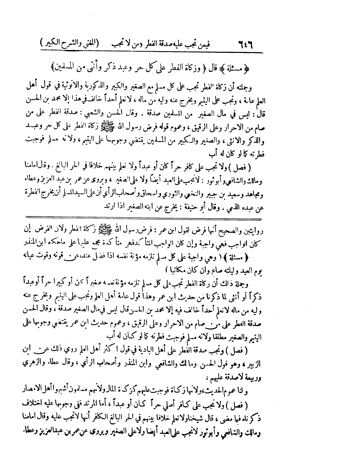 يوم العيد وليلته صاع وإن كان مكاتباً) وجملة ذلك أن زكاة الفطر تجب على كل مسلم تلزمه مؤنة نفسه صغيرا كان أو كبيراً حرا أو عبدا ذكرا أو انثى لما ذكرنا من حديث ابن عمر وهذا قول عامة أهل العلم وتجب على اليتيم ويخرج عنه وليه من ماله لا نعلم أحدا خالف فيه إلا محمد بن الحسن قال ليس في مال الصغير صدقة، وقال الحسن صدقة الفطر على من صام من الاحرار وعلى الرقبق، وعموم حديث ابن عمر يقتضي وجوبها على اليتيم والصغير مطلقا ولانه مسلم فوجبت فطرته كما لو كان له أب (فصل) ولا تجب صدقة الفطر على أهل البادية في قول أكثر أهل العلم روي ذلك عن ابن الزبير، وهو قول الحسن ومالك والشافعي وابن المنذر وأصحاب الرأي، وقال عطاء والزهري وربيعة لا صدقة عليهم: ولنا عموم الحديث، ولانها زكاة فوجبت عليهم كزكاة المال ولانهم مسلمون أشبهوا أهل الامصار (فصل) ولا تجب على كافر أصلي حراً كان أو عبداً، أما المرتد ففي وجوبها عليه اختلاف ذكرناه فيما مضى، قال شيخنا ولا نعلم خلافا بينهم في الحر البالغ الكافر أنها لا تجب عليه وقال امامنا ومالك والشافعي وأبو ثور لا تجب على العبد أيضاً ولا على الصغير ويروى عن عمر بن عبد العزيز وعطاء
