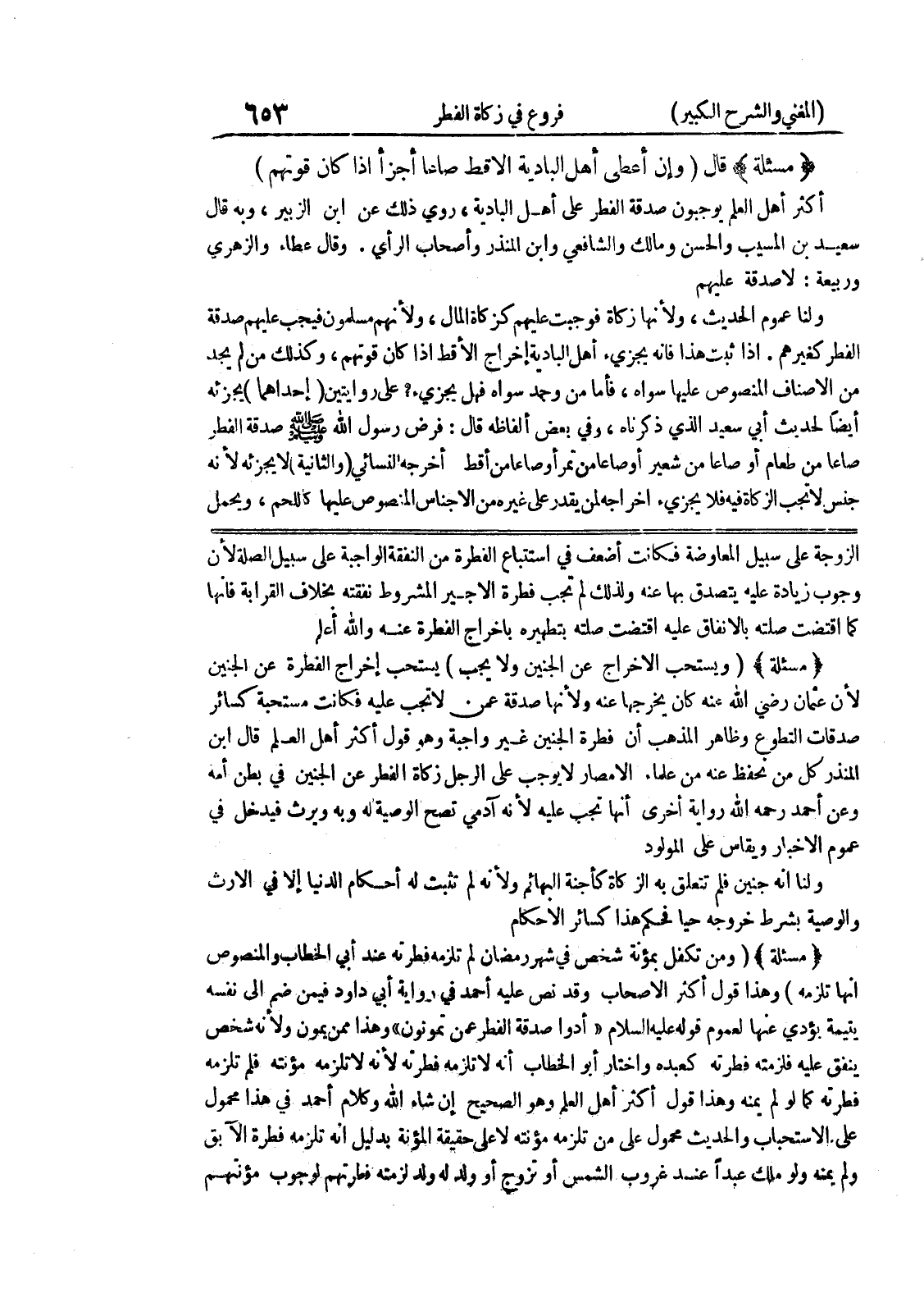 الزوجة على سبيل المعاوضة فكانت أضعف في استتباع الفطرة من النفقة الواجبة على سبيل الصلة لأن وجوب زيادة عليه يتصدق بها عنه ولذلك لم تجب فطرة الاجير المشروط نفقته بخلاف القرابة فانها كما اقتضت صلته بالانفاق عليه اقتضت صلته بتطهيره باخراج الفطرة عنه والله أعلم * (مسألة) * (ويستحب الإخراج عن الجنين ولا يجب) يستحب إخراج الفطرة عن الجنين لأن عثمان رضي الله عنه كان يخرجها عنه ولأنها صدقة عمن لا تجب عليه فكانت مستحبة كسائر صدقات التطوع وظاهر المذهب أن فطرة الجنين غير واجبة وهو قول أكثر أهل العلم قال ابن المنذر كل من نحفظ عنه من علماء الأمصار لا يوجب على الرجل زكاة الفطر عن الجنين في بطن أمه وعن أحمد رحمه الله رواية أخرى أنها تجب عليه لأنه آدمي تصح الوصية له وبه ويرث فيدخل في عموم الأخبار ويقاس على المولود ولنا أنه جنين فلم تتعلق به الزكاة كأجنة البهائم ولأنه لم تثبت له أحكام الدنيا إلا في الارث والوصية بشرط خروجه حيا فحكم هذا كسائر الأحكام * (مسألة) * (ومن تكفل بمؤنة شخص في شهر رمضان لم تلزمه فطرته عند أبي الخطاب والمنصوص انها تلزمه) وهذا قول أكثر الاصحاب وقد نص عليه أحمد في رواية أبي داود فيمن ضم الى نفسه يتيمة يؤدي عنها لعموم قوله عليه السلام " أدوا صدقة الفطر عمن تمونون " وهذا ممن يمون ولأنه شخص