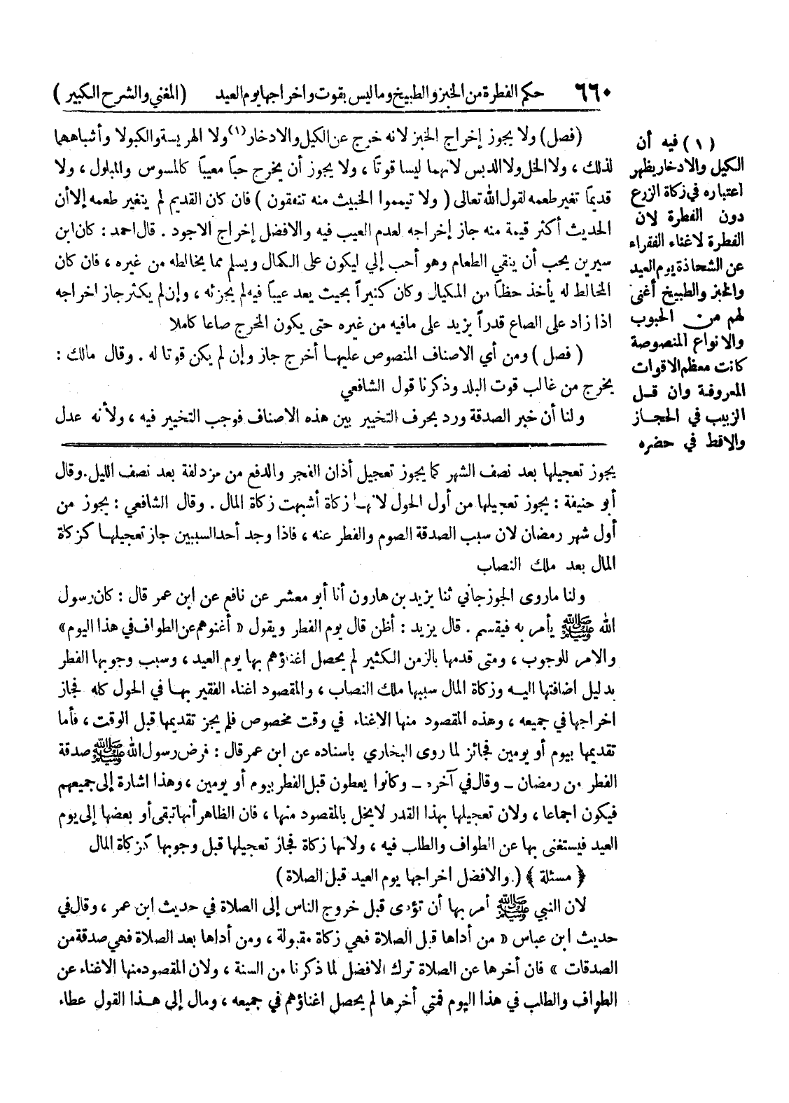 قال يزيد: أظن قال يوم الفطر ويقول " أغنوهم عن الطواف في هذا اليوم " والامر للوجوب، ومتى قدمها بالزمن الكثير لم يحصل اغناؤهم بها يوم العيد، وسبب وجوبها الفطر بدليل اضافتها اليه وزكاة المال سببها ملك النصاب، والمقصود اغناء الفقير بها في الحول كله فجاز اخراجها في جميعه، وهذا المقصود منها الاغناء في وقت مخصوص فلم يجز تقديمها قبل الوقت، أما تقديمها بيوم أو يومين فجائز لما روى البخاري بإسناده عن ابن عمر قال: فرض رسول الله صلى الله عليه وسلم صدقة الفطر من رمضان - وقال في آخره - وكانوا يعطون قبل الفطر بيوم أو يومين، وهذا إشارة إلى جميعهم فيكون إجماعاً، ولأن تعجيلها بهذا القدر لا يخل بالمقصود منها، فإن الظاهر أنها تبقى أو بعضها إلى يوم العيد فيستغنى بها عن الطواف والطلب فيه، ولانها زكاة فجاز تعجيلها قبل وجوبها كزكاة المال * (مسألة) * (والأفضل إخراجها يوم العيد قبل الصلاة) لأن النبي صلى الله عليه وسلم أمر بها أن تؤدى قبل خروج الناس إلى الصلاة في حديث ابن عمر، وقال في