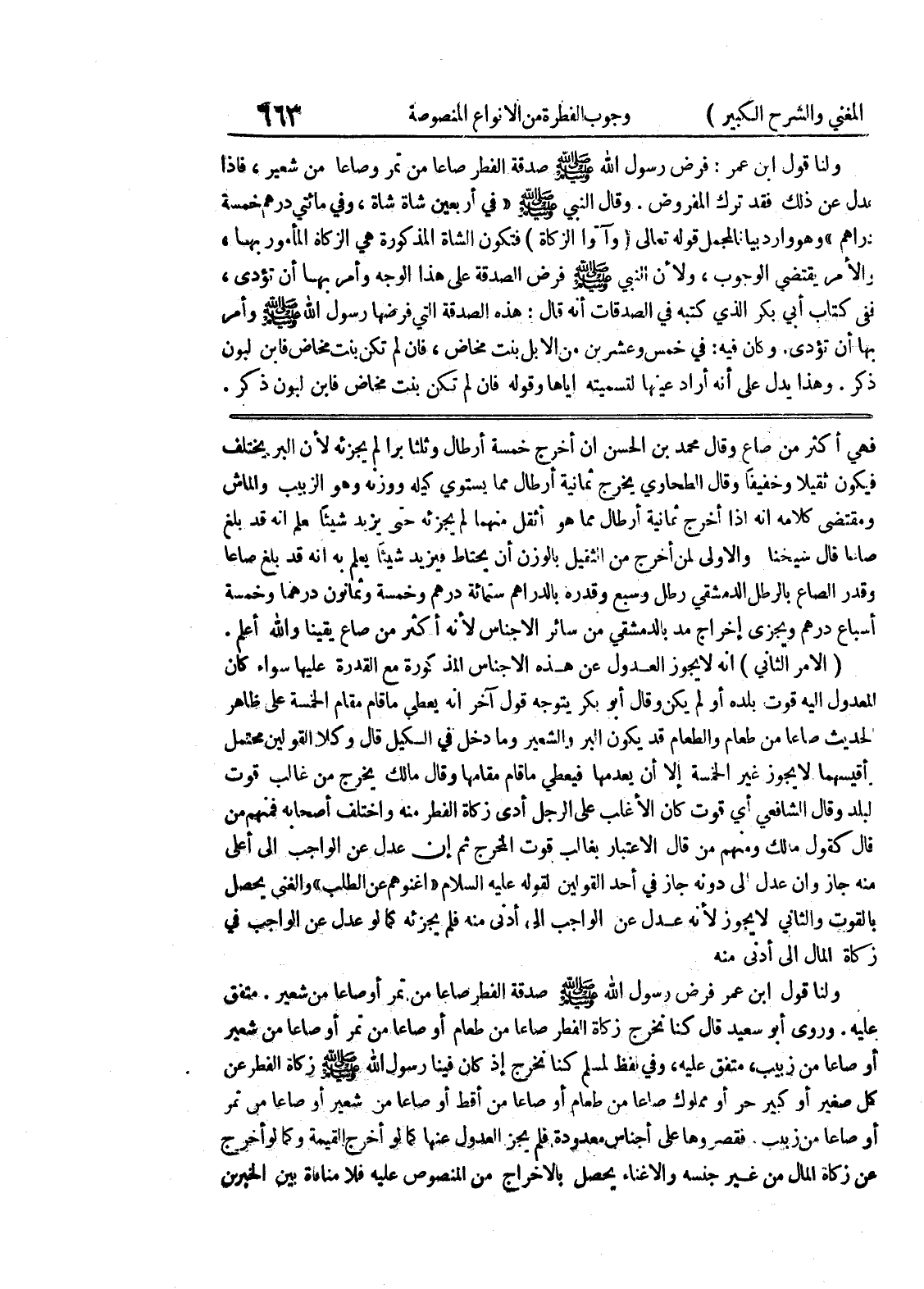 فهي أكثر من صاع وقال محمد بن الحسن أن أخرج خمسة أرطال وثلثا برا لم يجزئه لأن البر يختلف فيكون ثقيلا وخفيفاً وقال الطحاوي يخرج ثمانية أرطال مما يستوي كيله ووزنه وهو الزبيب والماش ومقتضى كلامه أنه إذا أخرج ثمانية أرطال مما هو أثقل منهما لم يجزئه حتى يزيد شيئاً يعلم أنه قد بلغ صاعا قال شيخنا والأولى لمن أخرج من الثقيل بالوزن أن يحتاط فيزيد شيئاً يعلم به أنه قد بلغ صاعا وقدر الصاع بالرطل الدمشقي رطل وسبع وقدره بالدراهم ستمائة درهم وخمسة وثمانون درهما وخمسة أسباع درهم ويجزي إخراج مد بالدمشقي من سائر الاجناس لأنه أكثر من صاع يقينا والله أعلم.