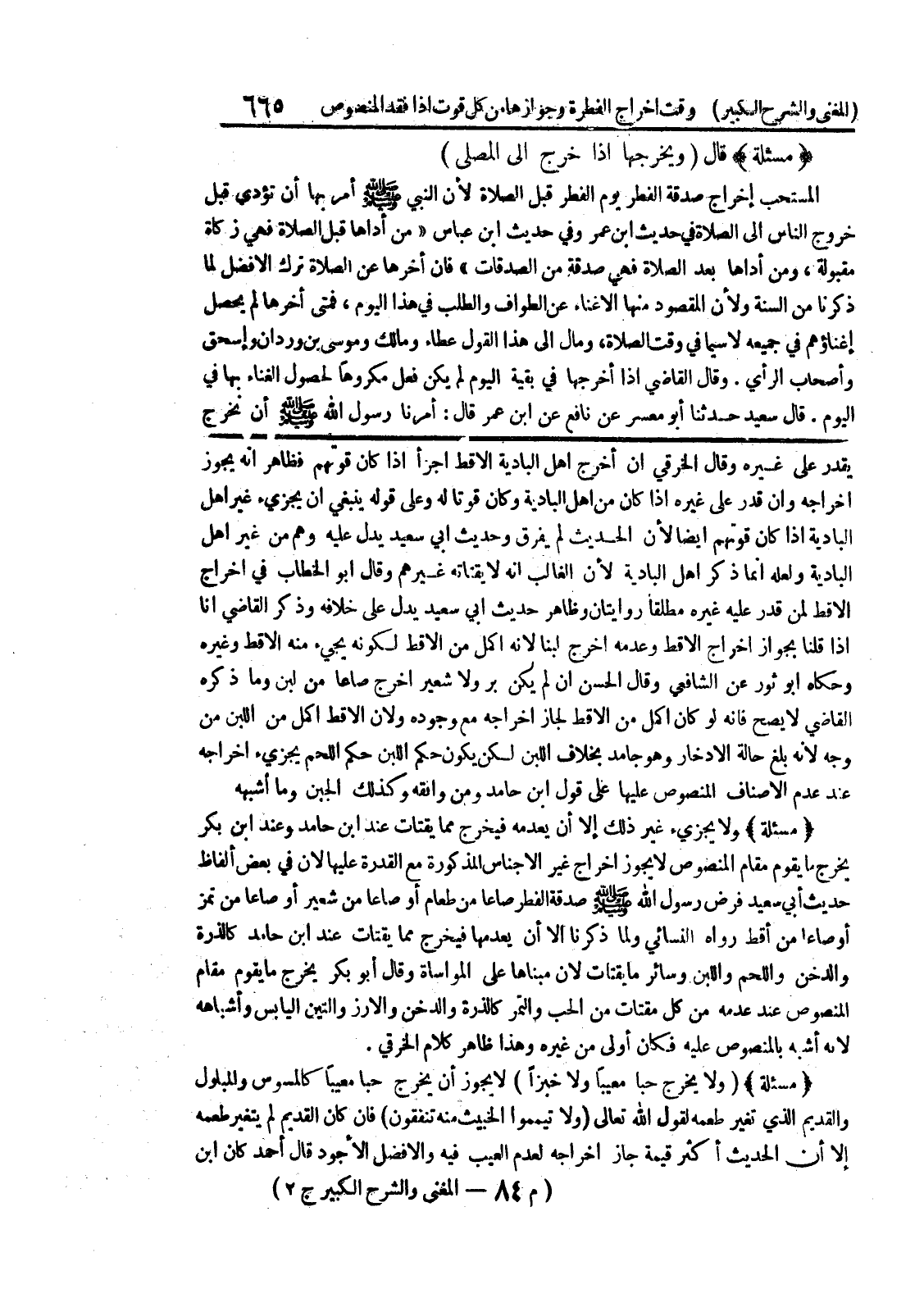 البادية اذا كان قوتهم أيضاً لأن الحديث لم يفرق وحديث أبي سعيد يدل عليه وهم من غير أهل البادية ولعله انما ذكر أهل البادية لأن الغالب أنه لا يقتاته غيرهم وقال أبو الخطاب في اخراج الاقط لمن قدر عليه غيره مطلقاً روايتان وظاهر حديث أبي سعيد يدل على خلافه وذكر القاضي أنا إذا قلنا يجواز اخراج الاقط وعدمه اخرج لبنا لأنه أكمل من الاقط لكونه يجئ منه الاقط وغيره وحكاه أبو ثور عن الشافعي وقال الحسن إن لم يكن بر ولا شعير اخرج صاعا من لبن وما ذكره القاضي لا يصح فإنه لو كان اكمل من الاقط لجاز اخراجه مع وجوده ولان الاقط اكمل من اللبن من وجه لانه بلغ حالة الادخار وهو جامد بخلاف اللبن لكن يكون حكم اللبن حكم اللحم يجزئ اخراجه عند عدم الاصناف المنصوص عليها على قول ابن حامد ومن وافقه وكذلك الجبن وما أشبهه * (مسألة) * ولا يجزئ غير ذلك إلا أن يعدمه فيخرج مما يقتات عند ابن حامد وعند ابن بكر يخرج ما يقوم مقام المنصوص لا يجوز إخراج غير الاجناس المذكورة مع القدرة عليها لأن في بعض ألفاظ حديث أبي سعيد فرض رسول الله صلى الله عليه وسلم صدقة الفطر صاعاً من طعام أو صاعا من شعير أو صاعا من تمز أو صاعا من أقط رواه النسائي ولما ذكرنا إلا أن يعدمها فيخرج مما يقتات عند ابن حامد كالذرة والدخن واللحم واللبن وسائر ما يقتات لأن مبناها على المواساة وقال أبو بكر يخرج ما يقوم مقام المنصوص عند عدمه من كل مقتات من الحب والتمر كالذرة والدخن والأرز والتين اليابس وأشباهه لانه أشبه بالمنصوص عليه فكان أولى من غيره وهذا ظاهر كلام الخرقي.