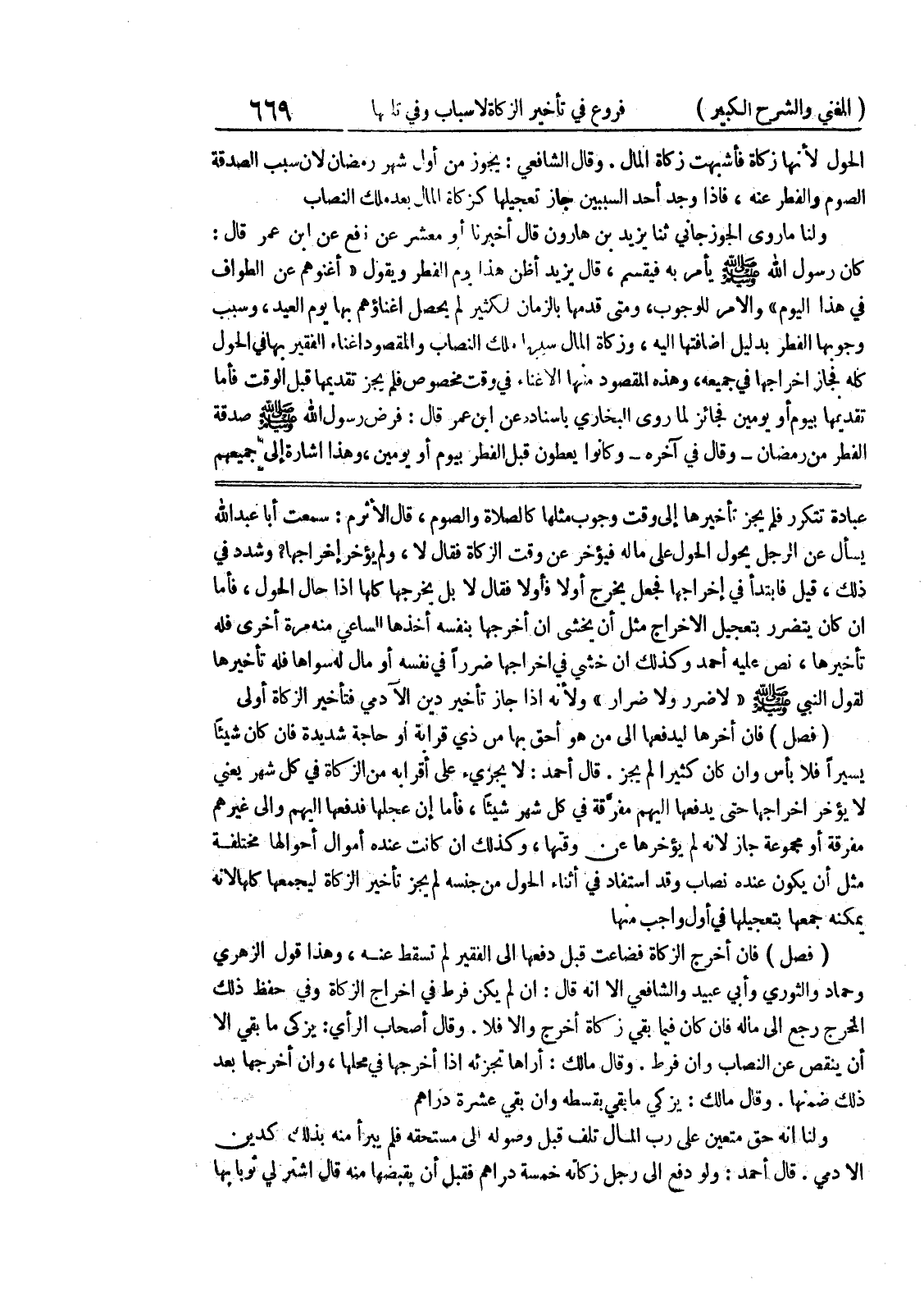 عبادة تتكرر فلم يجز تأخيرها إلى وقت وجوب مثلها كالصلاة والصوم، قال الأثرم: سمعت أبا عبد الله يسأل عن الرجل يحول الحول على ماله فيؤخر عن وقت الزكاة فقال لا، ولم يؤخر إخراجه؟ وشدد في ذلك، قيل فابتدأ في إخراجها فجعل يخرج أولا فأولا فقال لا بل يخرجها كلها اذا حال الحول، فأما إن كان يتضرر بتعجيل الاخراج مثل أن يخشى ان أخرجها بنفسه أخذها الساعي منه مرة أخرى فله تأخيرها، نص عليه أحمد وكذلك إن خشي في اخراجها ضرراً في نفسه أو مال له سواها فله تأخيرها لقول النبي صلى الله عليه وسلم " لا ضرر ولا ضرار " ولأنه إذا جاز تأخير دين الآدمي فتأخير الزكاة أولى (فصل) فان أخرها ليدفعها إلى من هو أحق بها من ذي قرابة أو حاجة شديدة فان كان شيئاً يسيراً فلا بأس وإن كان كثيراً لم يجز.