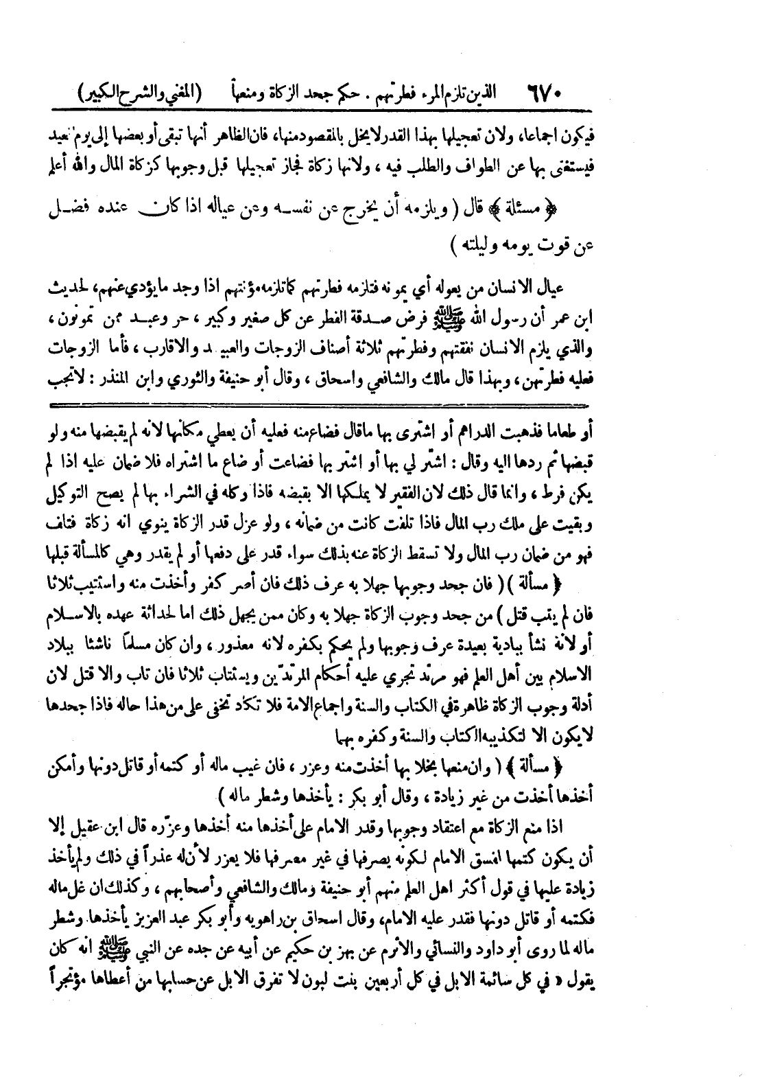 أو طعاما فذهبت الدراهم أو اشترى بها ما قال فضاع منه فعليه أن يعطي مكانها لانه لم يقبضها منه ولو قبضها ثم ردها اليه وقال: اشتر لي بها أو اشتر بها فضاعت أو ضاع ما إشتراه فلا ضمان عليه إذا لم يكن فرط، وإنما قال ذلك لأن الفقير لا يملكها إلا بقبضه فإذا وكله في الشراء بها لم يصح التوكيل وبقيت على ملك رب المال فإذا تلفت كانت من ضمانه، ولو عزل قدر الزكاة ينوي انه زكاة فتلف فهو من ضمان رب المال ولا تسقط الزكاة عنه بذلك سواء قدر على دفعها أو لم يقدر وهي كالمسألة قبلها * (مسألة) (فان جحد وجوبها جهلا به عرف ذلك فان أصر كفر وأخذت منه واستتيب ثلاثاً فان لم يتب قتل) من جحد وجوب الزكاة جهلا به وكان ممن يجهل ذلك اما لحداثة عهده بالاسلام أو لأنه نشأ ببادية بعيدة عرف وجوبها ولم يحكم بكفره لأنه معذور، وان كان مسلما ناشئا ببلاد الاسلام بين أهل العلم فهو مرتد تجري عليه أحكام المرتدين ويسثتاب ثلاثاً فإن تاب وإلا قتل لان أدلة وجوب الزكاة ظاهرة في الكتاب والسنة واجماع الامة فلا تكاد تخفى على من هذا حاله فاذا جحدها لا يكون إلا لتكذيبه الكتاب والسنة وكفره بهما