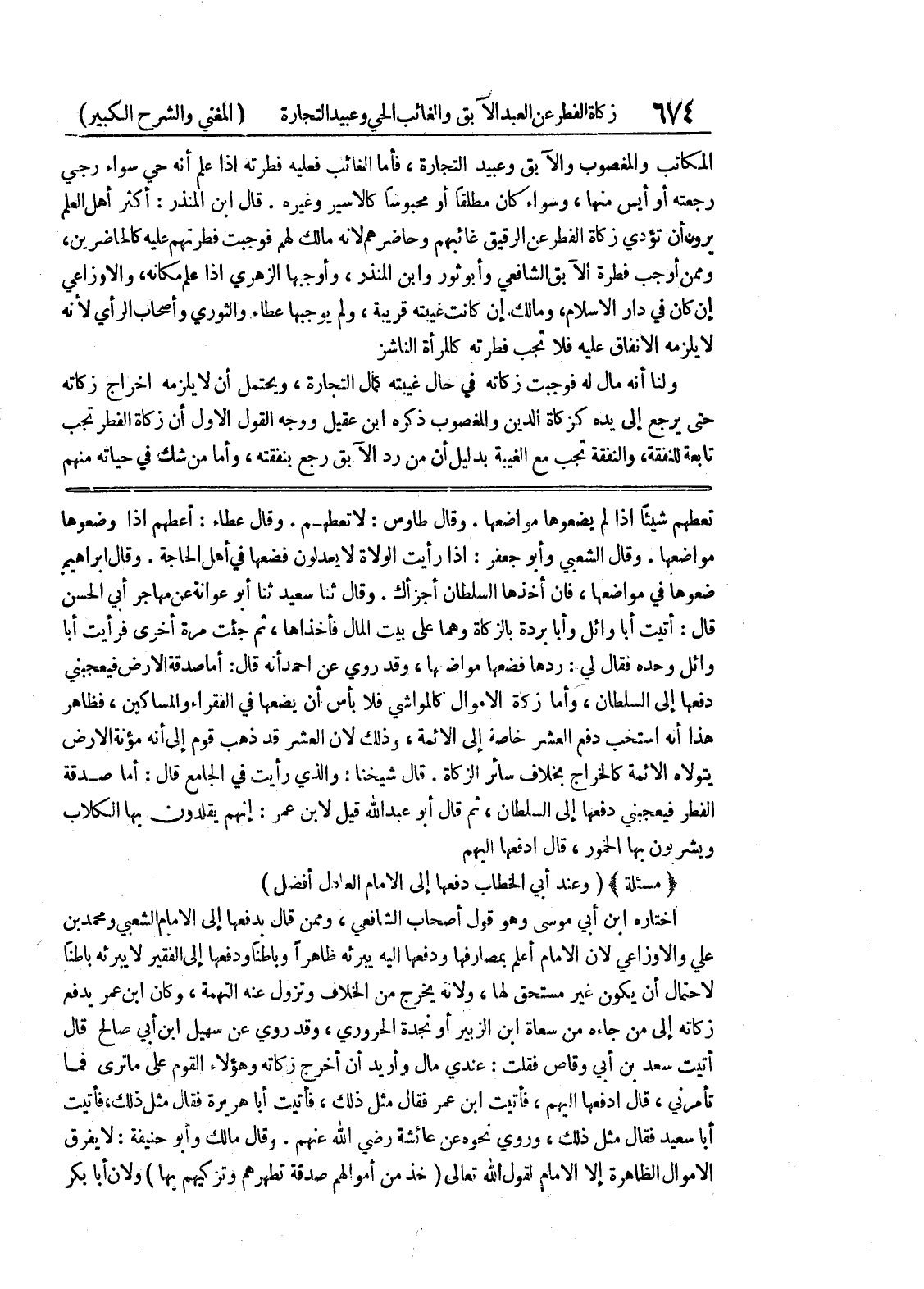 قال شيخنا: والذي رأيت في الجامع قال: أما صدقة الفطر فيعجبني دفعها إلى السلطان، ثم قال أبو عبد الله قيل لابن عمر: إنهم يقلدون بها الكلاب ويشربون بها الخمور، قال ادفعها اليهم * (مسألة) * (وعند أبي الخطاب دفعها إلى الإمام العادل أفضل) اختاره ابن أبي موسى وهو قول أصحاب الشافعي، وممن قال بدفعها إلى الامام الشعبي ومحمد بن علي والاوزاعي لان الامام أعلم بمصارفها ودفعها اليه يبرئه ظاهراً وباطناً ودفعها إلى الفقير لا يبرئه باطناً لاحتمال أن يكون غير مستحق لها، ولانه يخرج من الخلاف وتزول عنه التهمة، وكان ابن عمر يدفع