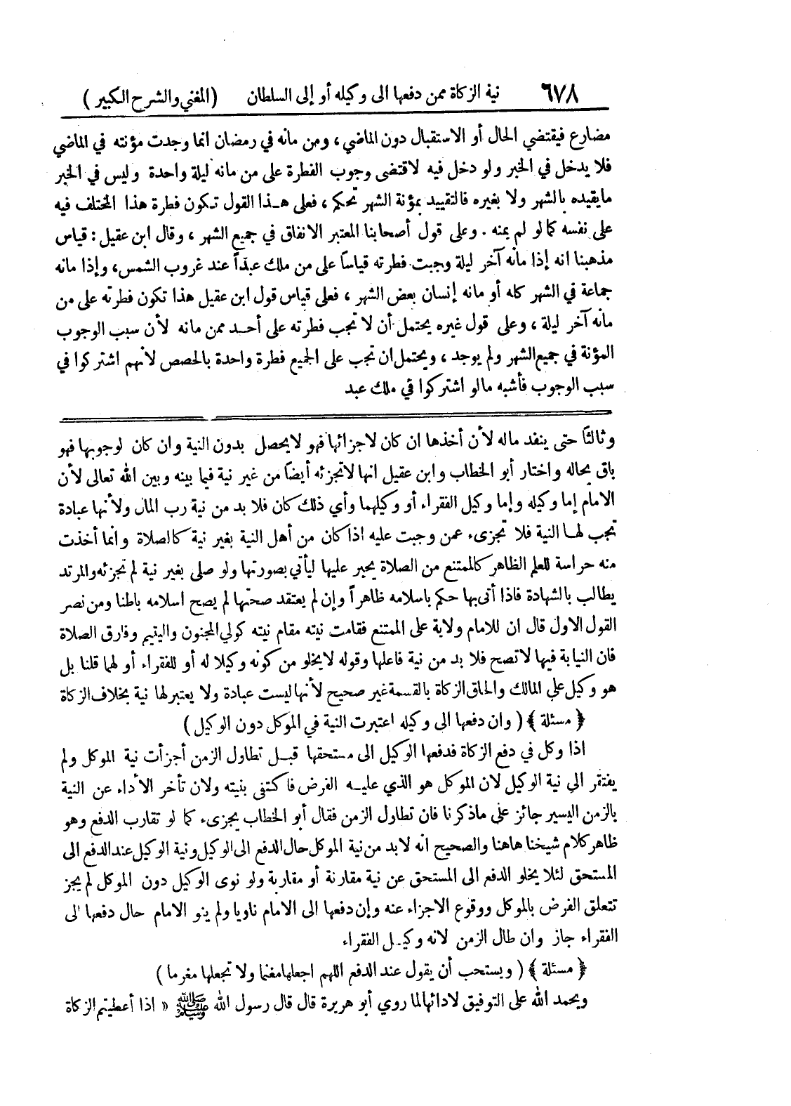 وثالثاً حتى ينفد ماله لأن أخذها ان كان لاجزائها فهو لا يحصل بدون النية وإن كان لوجوبها فهو باق بحاله واختار أبو الخطاب وابن عقيل أنها لا تجزئه أيضاً من غير نية فيما بينه وبين الله تعالى لأن الامام إما وكيله وإما وكيل الفقراء أو وكيلهما وأي ذلك كان فلا بد من نية رب المال ولأنها عبادة تجب لها النية فلا تجزئ عمن وجبت عليه إذا كان من أهل النية بغير نية كالصلاة وانما أخذت منه حراسة للعلم الظاهر كالممتنع من الصلاة يحبر عليها ليأتي بصورتها ولو صلى بغير نية لم تجزئه والمرتد يطالب بالشهادة فإذا أتى بها حكم باسلامه ظاهراً وإن لم يعتقد صحتها لم يصح إسلامه باطنا ومن نصر القول الأول قال ان للامام ولاية على الممتنع فقامت نيته مقام نيته كولي المجنون واليتيم وفارق الصلاة فإن النيابة فيها لا تصح فلابد من نية فاعلها وقوله لا يخلو من كونه وكيلا له أو للفقراء أو لهما قلنا بل هو وكيل على المالك والحاق الزكاة بالقسمة غير صحيح لأنها ليست عبادة ولا يعتبر لها نية بخلاف الزكاة * (مسألة) * (وإن دفعها إلى وكيله اعتبرت النية في الموكل دون الوكيل) إذا وكل في دفع الزكاة فدفعها الوكيل الى مستحقها قبل تطاول الزمن أجزأت نية الموكل ولم يفتقر الى نية الوكيل لان الموكل هو الذي عليه الفرض فاكتفى بنيته ولان تأخر الأداء عن النية بالزمن اليسير جائز على ما ذكرنا فان تطاول الزمن فقال أبو الخطاب يجزئ كما لو تقارب الدفع وهو ظاهر كلام شيخنا ها هنا والصحيح انه لابد من نية الموكل حال الدفع الى الوكيل ونية الوكيل عند الدفع الى المستحق لئلا يخلو الدفع الى المستحق عن نية مقارنة أو مقاربة ولو نوى الوكيل دون الموكل لم يجز تتعلق الفرض بالموكل ووقوع الاجزاء عنه وإن دفعها إلى الامام ناويا ولم ينو الامام حال دفعها الى الفقراء جاز وإن طال الزمن لأنه وكيل الفقراء * (مسألة) * (ويستحب أن يقول عند الدفع اللهم اجعلها مغنما ولا تجعلها مغرما) ويحمد الله على التوفيق لادائها لما روى أبو هريرة قال قال رسول الله صلى الله عليه وسلم " إذا أعطيتم الزكاة