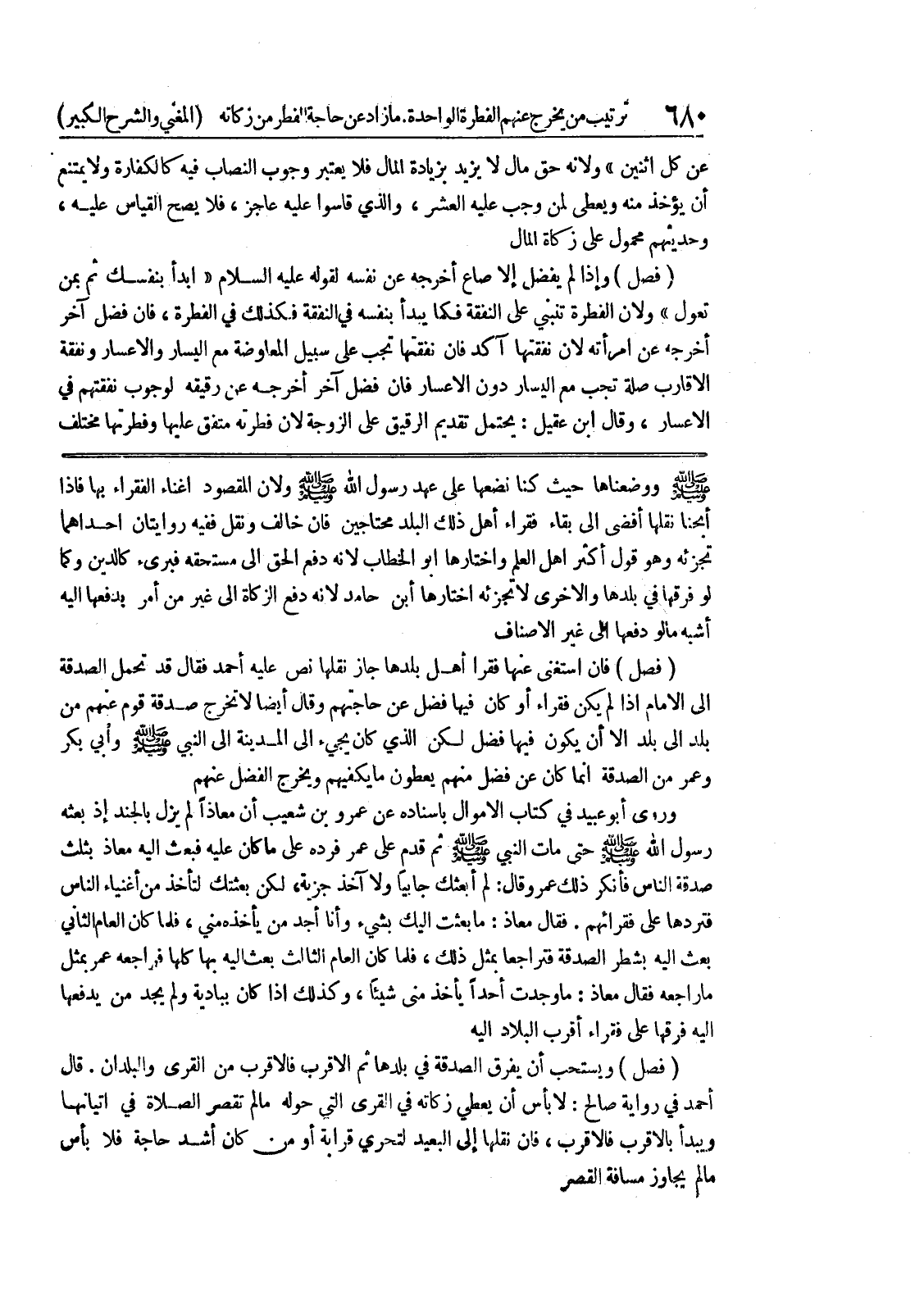 فقال معاذ: ما بعثت اليك بشئ وأنا اجد من يأخذه مني، فلما كان العام الثاني بعث إليه بشرط الصدقة فتراجعا بمثل ذلك، فلما كان العام الثالث بعث اليه بها كلها فراجعه عمر بمثل ما راجعه فقال معاذ: ما وجدت أحداً يأخذ مني شيئاً، وكذلك إذا كان ببادية ولم يجد من يدفعها اليه فرقها على فقراء أقرب البلاد اليه (فصل) ويستحب أن يفرق الصدقة في بلدها ثم الأقرب فالأقرب من القرى والبلدان.