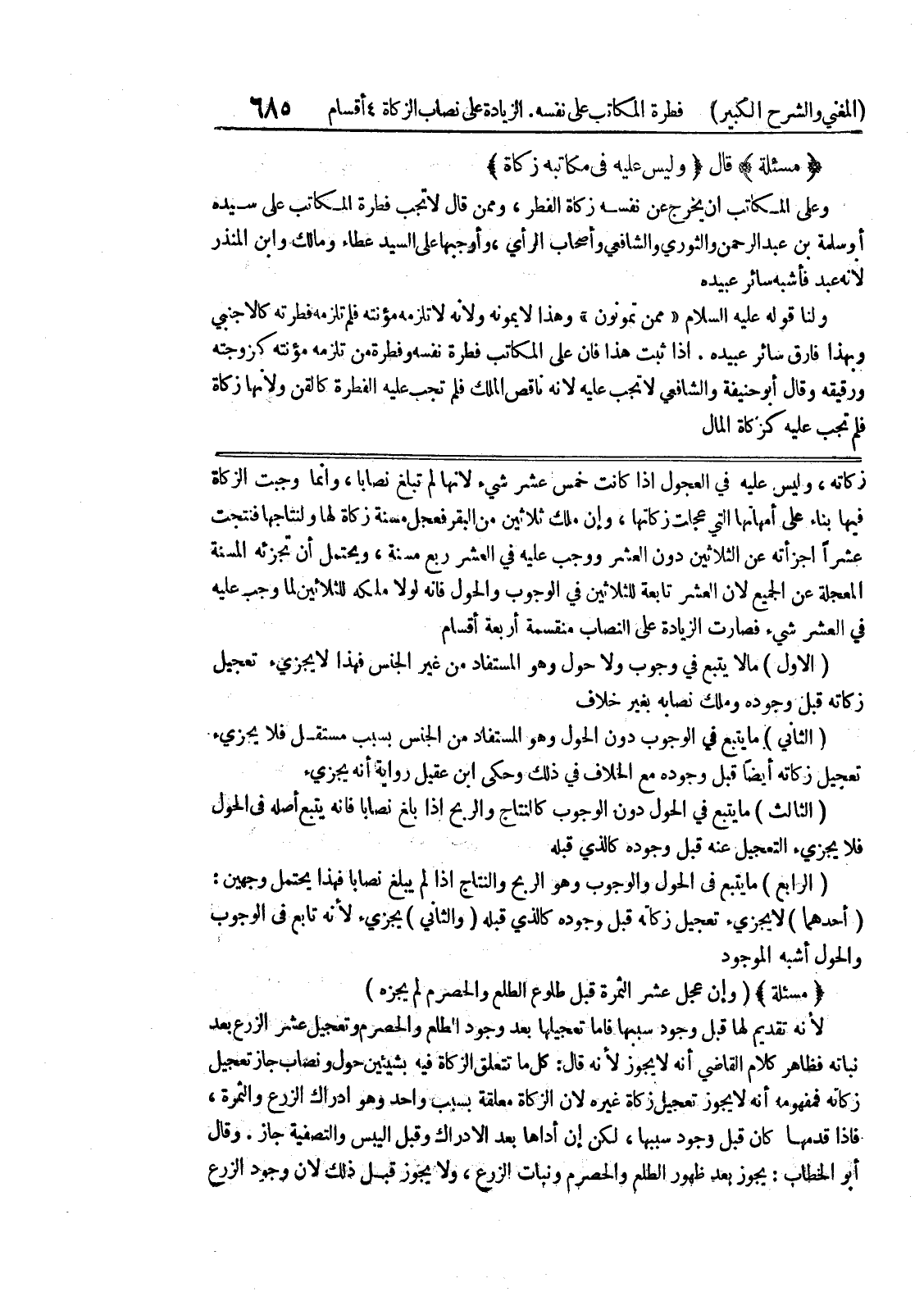 زكاته، وليس عليه في العجول اذا كانت خمس عشر شئ لانها لم تبلغ تصابا، وانما وجبت الزكاة فيها بناء على أمهاتها التي عجلت زكاتها، وإن ملك ثلاثين من البقر فعجل مسنة زكاة لها ولنتاجها فنتجت عشراً اجزأته عن الثلاثين دون العشر ووجب عليه في العشر ربع مسنة، ويحتمل أن تجزئه المسنة المعجلة عن الجميع لان العشر تابعة للثلاثين في الوجوب والحول فانه لولا ملكه للثلاثين لما وجب عليه في العشر شئ فصارت الزيادة على النصاب منقسمة أربعة أقسام (الأول) ما لا يتبع في وجوب ولا حول وهو المستفاد من غير الجنس فهذا لا يجزئ تعجيل زكاته قبل وجوده وملك نصابه بغير خلاف (الثاني) ما يتبع في الوجوب دون الحول وهو المستفاد من الجنس بسبب مستقل فلا يجزئ تعجيل زكاته أيضاً قبل وجوده مع الخلاف في ذلك وحكي ابن عقيل رواية أنه يجزئ (الثالث) ما يتبع في الحول دون الوجوب كالنتاج والريح إذا بلغ نصابا فانه يتبع أصله في الحول