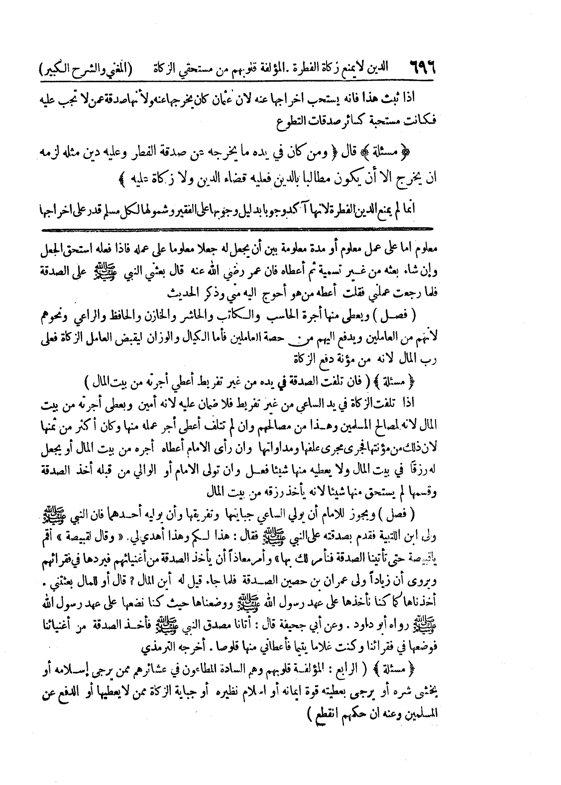 فلما رجعت عملني فقلت أعطه من هو أحوج اليه مني وذكر الحديث (فصل) ويعطى منها أجرة الحاسب والكاتب والحاشر والخازن والحافظ والراعي ونحوهم لانهم من العاملين ويدفع اليهم من حصة العاملين فأما الكيال والوزن ليقبض العامل الزكاة فعلى رب المال لأنه من مؤنة دفع الزكاة * (مسألة) * (فإن تلفت الصدقة في يده من غير تفريط أعطي أجرته من بيت المال) اذا تلفت الزكاة في يد الساعي من غير تفريط فلا ضمان عليه لانه أمين ويعطى أجرته من بيت المال لانه لمصالح المسلمين وهذا من مصالحهم وان لم تتلف أعطي أجر عمله منها وكان أكثر من ثمنها لأن ذلك من مؤنتها فجرى مجرى علفها ومداواتها وان رأى الامام أعطاه أجره من بيت المال أو يجعل له رزقاً في بيت المال ولا يعطيه منها شيئاً فعل وان تولى الامام أو الوالي من قبله أخذ الصدقة وقسمها لم يستحق منها شيئاً لأنه يأخذ رزقه من بيت المال (فصل) ويجوز للامام أن يولي الساعي جبايتها وتفريقها وأن يوليه أحدهما فإن النبي صلى الله عليه وسلم ولى ابن اللتبية فقدم بصدقته على النبي صلى الله عليه وسلم فقال: هذا لكم وهذا أهدي لي " وقال لقبيصة " أقم يا قبيصة حتى تأتينا الصدقة فنأمر لك بها " وأمر معاذاً أن يأخذ الصدقة من أغنيائهم فيردها في فقرائهم ويروى أن زياداً ولى عمران بن حصين الصدقة فلما جاء قيل له أين المال؟ قال أو للمال بعثتني.