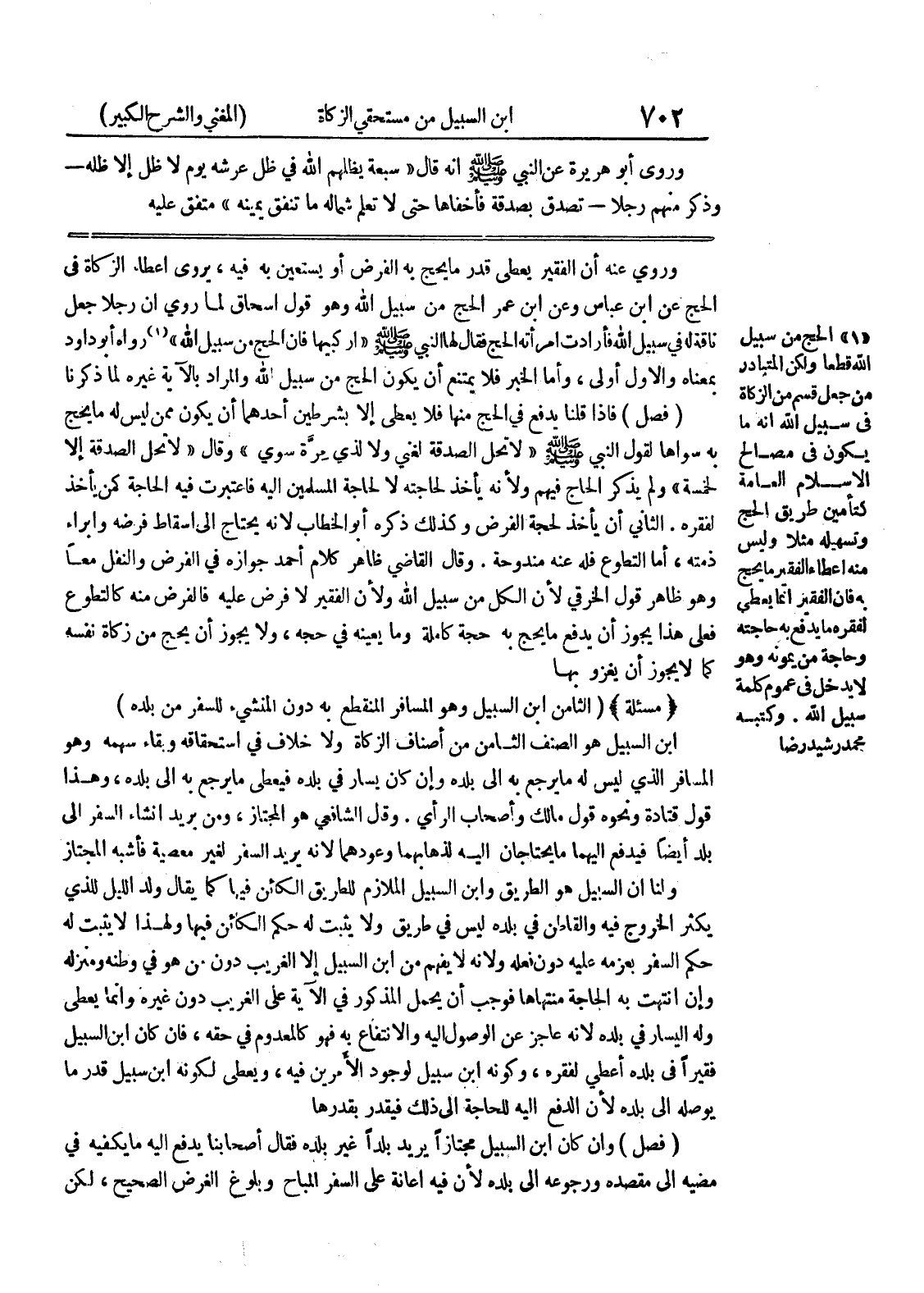 وروي عنه أن الفقير يعطى قدر ما يحج به الفرض أو يستعين به فيه، يروى اعطاء الزكاة في الحج عن ابن عباس وعن ابن عمر الحج من سبيل الله وهو قول إسحاق لما روي أن رجلا جعل ناقة له في سبيل الله فأرادت امرأته الحج فقال لها النبي صلى الله عليه وسلم " اركبيها فإن الحج من سبيل الله " (1) رواه أبو داود بمعناه والاول أولى، وأما الخبر فلا يمتنع أن يكون الحج من سبيل الله والمراد بالآية غيره لما ذكرنا (فصل) فإذا قلنا يدفع في الحج منها فلا يعطى إلا بشرطين أحدهما أن يكون ممن ليس له ما يحج به سواها لقول النبي صلى الله عليه وسلم " لا تحل الصدقة لغني ولا لذي مرة سوي " وقال " لا تحل الصدقة إلا لخمسة " ولم يذكر الحاج فيهم ولأنه يأخذ لحاجته لا لحاجة المسلمين اليه فاعتبرت فيه الحاجة كمن يأخذ لفقره.
