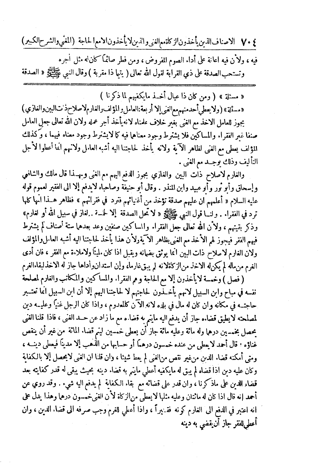 لغاز في سبيل الله أو لغارم " وذكر بقيتهم، ولأن الله تعالى جعل الفقراء والمساكين صنفين وعد بعدهما ستة أصناف لم يشترط فيهم الفقر فيجوز لهم الأخذ مع الغنى بظاهر الآية ولأن هذا يأخذ لحاجتنا إليه أشبه العامل والمؤلف ولان الغارم لإصلاح ذات البين انما يوثق بضمانه ويقبل اذا كان مليئاً ولا ملاءة مع الفقر، فان أدى الغرم من ماله لم يكن له الأخذ من الزكاة لأنه لم يبق غارما، وإن استدان وأداها جاز له الأخذ لبقاء الغرم (فصل) وخمسة لا يأخذون إلا مع الحاجة وهم الفقراء والمساكين والمكاتب والغارم لمصلحة نفسه في مباح وابن السبيل لانهم يأخذون لحاجتهم لا لحاجتنا اليهم إلا أن ابن السبيل انما تعتبر حاجته في مكانه وإن كان له مال في بلده لانه الآن كالمعدوم، واذا كان الرجل غنياً وعليه دين لمصلحة لا يطيق قضاءه جاز أن يدفع إليه ما يتم به قضاءه مع ما زاد عن حد الغنى، فاذا قلنا الغنى يحصل بخمسين درهما وله مائة وعليه مائة جاز أن يعطى خمسين ليتم قضاء المائة من غير أن ينقص غناؤه.