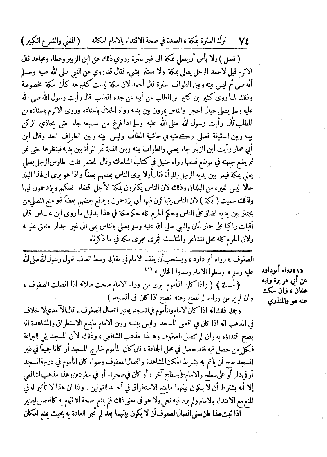 الصفوف " رواه أبو داود، ويستحب أن يقف الامام في مقابلة وسط الصف لقول رسول الله صلى الله عليه وسلم " وسطوا الإمام وسدوا الخلل " (1) * (مسألة) * وإذا كان المأموم يرى من وراء الامام صحت صلاته اذا اتصلت الصفوف، وإن لم ير من وراءه لم تصح وعنه تصح إذا كان في المسجد) وجملة ذلك أنه إذا كان الإمام والمأموم في المسجد يعتبر اتصال الصفوف.
