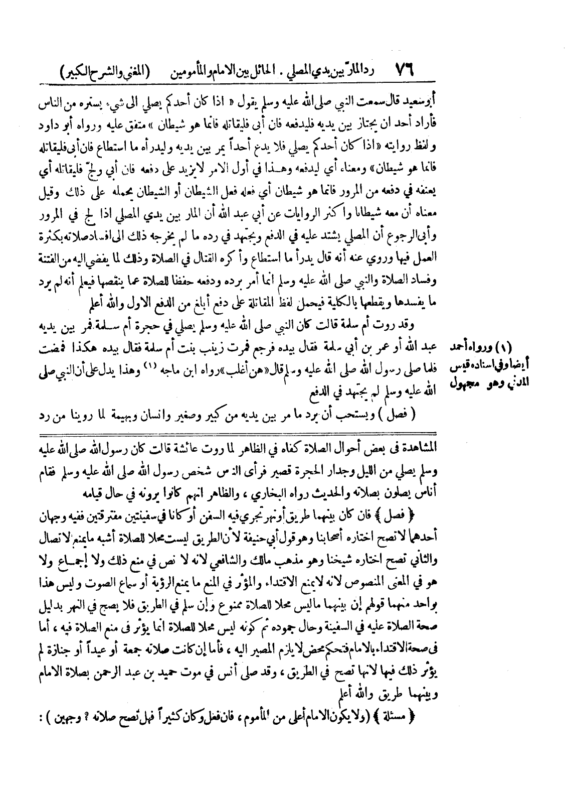 المشاهدة في بعض أحوال الصلاة كفاه في الظاهر لما روت عائشة قالت كان رسول الله صلى الله عليه وسلم يصلي من الليل وجدار الحجرة قصير فرأى الناس شخص رسول الله صلى الله عليه وسلم فقام أناس يصلون بصلاته والحديث رواه البخاري، والظاهر أنهم كانوا يرونه في حال قيامه * (فصل) * فإن كان بينهما طريق أو نهر تجري فيه السفن أو كانا في سفينتين مفترقتين ففيه وجهان أحدهما لا تصح اختاره أصحابنا وهو قول أبي حنيفة لأن الطريق ليست محلا للصلاة أشبه ما يمنع لاتصال والثاني تصح اختاره شيخنا وهو مذهب مالك والشافعي لأنه لا نص في منع ذلك ولا إجماع ولا هو في المعنى المنصوص لأنه لا يمنع الاقتداء والمؤثر في المنع ما يمنع الرؤية أو سماع الصوت وليس هذا بواحد منهما قولهم إن بينهما ما ليس محلا للصلاة ممنوع وإن سلم في الطريق فلا يصح في النهر بدليل