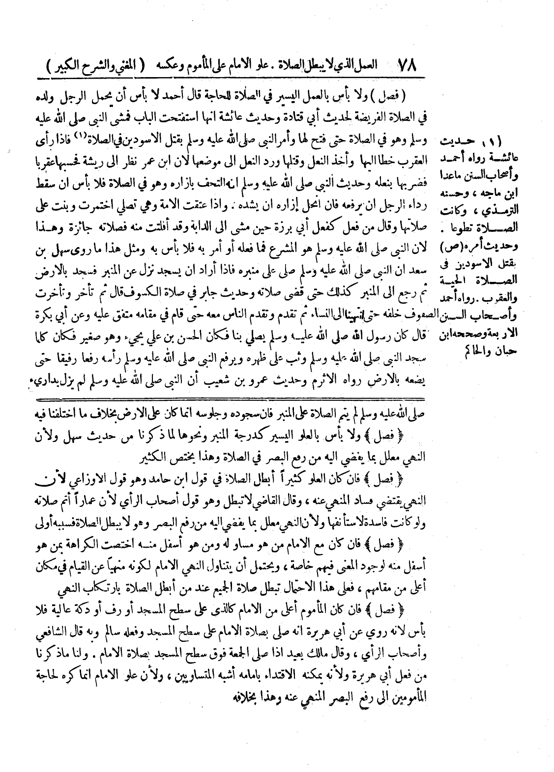 * (فصل) * ولا بأس بالعلو اليسير كدرجة المنبر ونحوها لما ذكرنا من حديث سهل ولأن النهي معلل بما يفضي إليه من رفع البصر في الصلاة وهذا يختص الكثير * (فصل) * فإن كان العلو كثيراً أبطل الصلاة في قول ابن حامد وهو قول الأوزاعي لأن النهي يقتضي فساد المنهي عنه، وقال القاضي لا تبطل وهو قول أصحاب الرأي لأن عماراً أتم صلاته ولو كانت فاسدة لاستأنفها ولأن النهي معلل بما يفضي إليه من رفع البصر وهو لا يبطل الصلاة فسببه أولى * (فصل) * فإن كان مع الامام من هو مساو له ومن هو أسفل منه اختصت الكراهة بمن هو أسفل منه لوجود المعنى فيهم خاصة، ويحتمل أن يتناول النهي الامام لكونه منهياً عن القيام في مكان أعلى من مقامهم، فعلى هذا الاحتمال تبطل صلاة الجميع عند من أبطل الصلاة بارتكاب النهي * (فصل) * فإن كان المأموم أعلى من الامام كالذي على سطح المسجد أو رف أو دكة عالية فلا بأس لأنه روي عن ابي هريرة أنه صلى بصلاة الامام على سطح المسجد وفعله سالم وبه قال الشافعي وأصحاب الرأي، وقال مالك يعيد اذا صلى الجمعة فوق سطح المسجد بصلاة الإمام.
