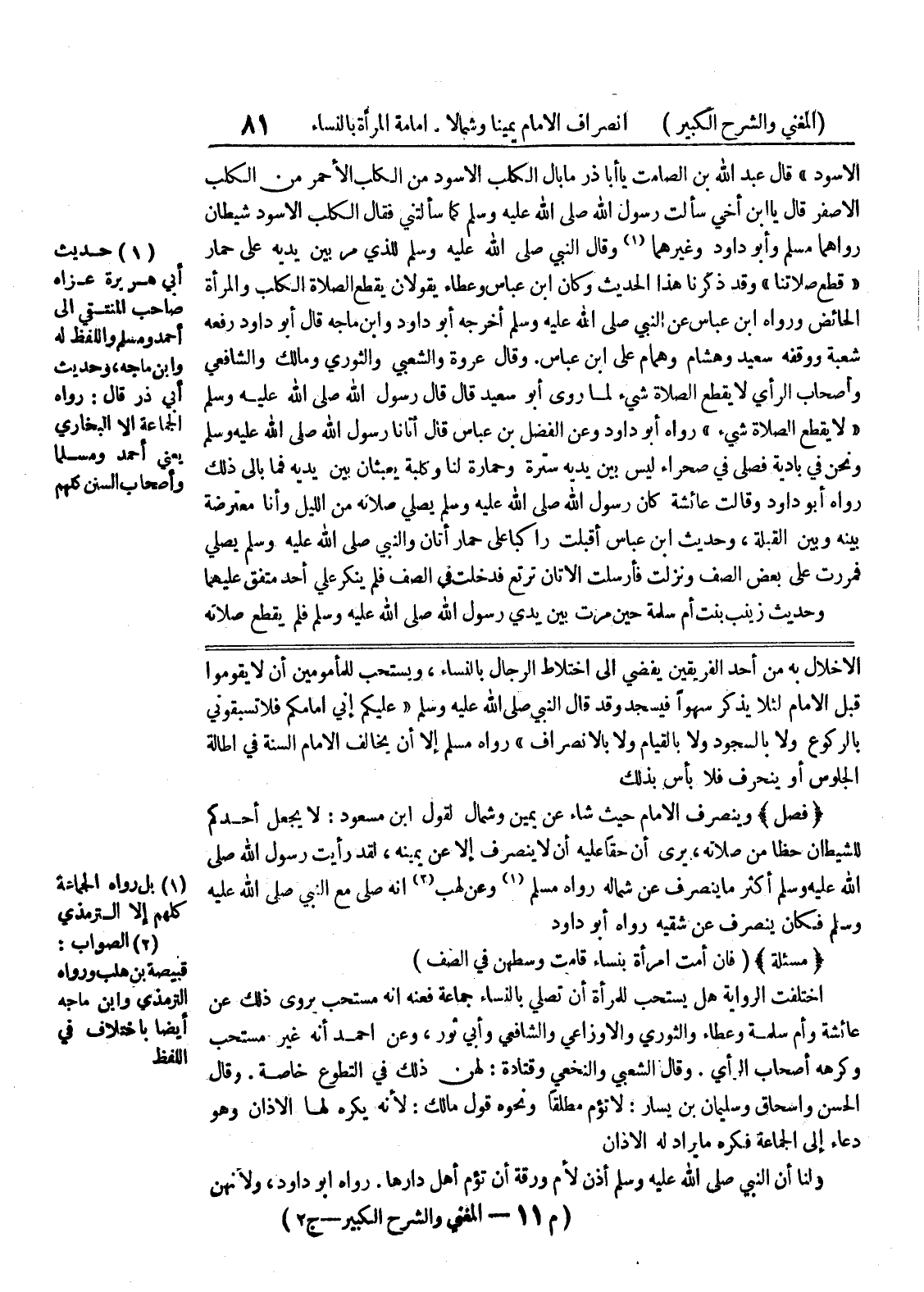 الاخلال به من أحد الفريقين يفضي الى اختلاط الرجال بالنساء، ويستحب للمأمومين أن لا يقوموا قبل الامام لئلا يذكر سهواً فيسجد وقد قال النبي صلى الله عليه وسلم " عليكم إني إمامكم فلا تسبقوني بالركوع ولا بالسجود ولا بالقيام ولا بالانصراف " رواه مسلم إلا أن يخالف الامام السنة في إطالة الجلوس أو ينحرف فلا بأس بذلك * (فصل) * وينصرف الامام حيث شاء عن يمين وشمال لقول ابن مسعود: لا يجعل أحدكم للشيطان حظاً من صلاته، يرى أن حقاً عليه أن لا ينصرف إلا عن يمينه، لقد رأيت رسول الله صلى الله عليه وسلم أكثر ما ينصرف عن شماله رواه مسلم (1) وعن لهب (2) أنه صلى مع النبي صلى الله عليه وسلم فكان ينصرف عن شقيه رواه أبو داود * (مسألة) * (فإن أمت امرأة بنساء قامت وسطهن في الصف) اختلفت الرواية هل يستحب للمرأة أن تصلي بالنساء جماعة فعنه أنه مستحب يروي ذلك عن عائشة وأم سلمة وعطاء والثوري والاوزاعي والشافعي وأبي ثور، وعن أحمد أنه غير مستحب وكرهه أصحاب الرأي.