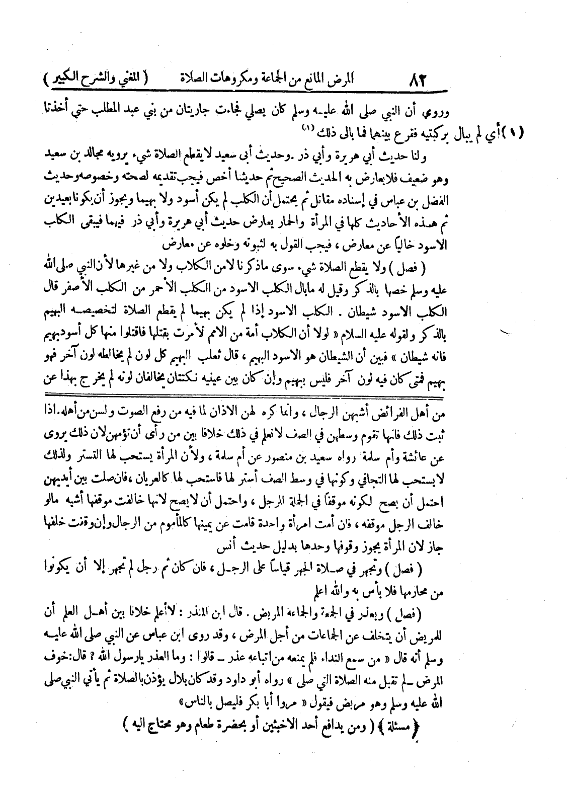 قال إبن المنذر: لا أعلم خلافاً بين أهل العلم أن للمريض أن يتخلف عن الجماعات من أجل المرض، وقد روى ابن عباس عن النبي صلى الله عليه وسلم أنه قال " من سمع النداء فلم يمنعه من إتباعه عذر - قالوا: وما العذر يا رسول الله؟ قال: خوف المرض - لم تقبل منه الصلاة التي صلى " رواه أبو داود وقد كان بلال يؤذن بالصلاة ثم يأتي النبي صلى الله عليه وسلم وهو مريض فيقول " مروا أبا بكر فليصل بالناس " * (مسألة) * (ومن يدافع أحد الاخبثين أو بحضرة طعام وهو محتاج إليه)