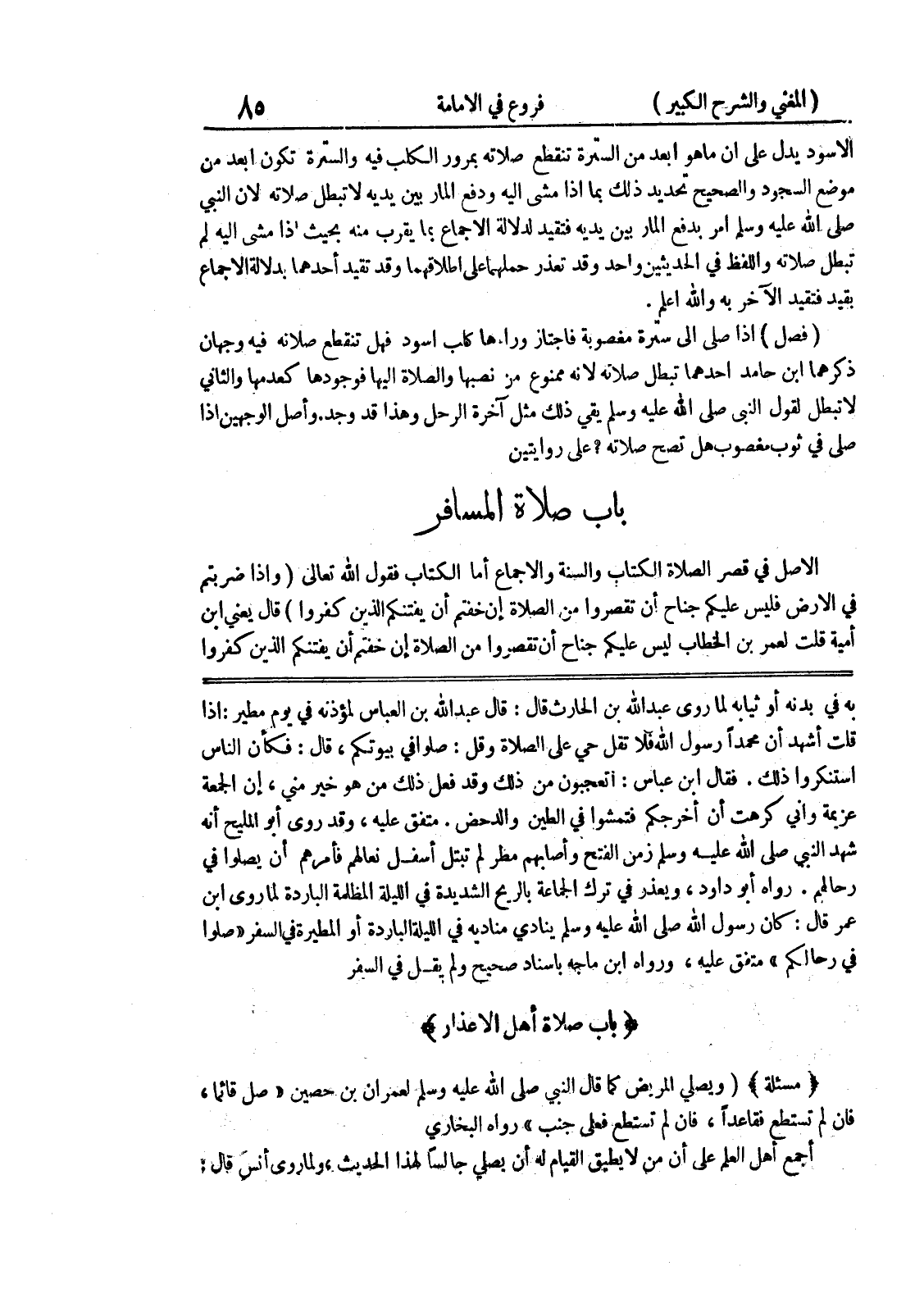 رواه أبو داود، ويعذر في ترك الجماعة بالريح الشديدة في الليلة المظلمة الباردة لما روى ابن عمر قال: كان رسول الله صلى الله عليه وسلم ينادي مناديه في الليلة الباردة أو المطيرة في السفر " صلوا في رحالكم " متفق عليه، ورواه ابن ماجة بإسناد صحيح ولم يقل في السفر * (باب صلاة أهل الاعذار) * * (مسألة) * (ويصلي المريض كما قال النبي صلى الله عليه وسلم لعمران بن حصين " صل قائماً، فإن لم تستطع فقاعداً، فإن لم تستطع فعلى جنب " رواه البخاري أجمع أهل العلم على أن من لا يطبق القيام له أن يصلي جالساً لهذا الحديث، ولما روى أنس قال: