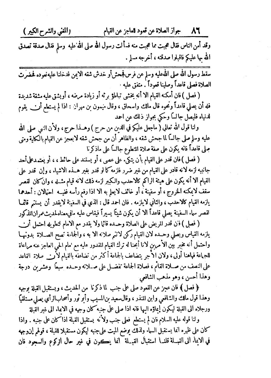 متفق عليه (فصل) فإن أمكنه القيام إلا أنه يخشى تباطؤ برئه أو زيادة مرضه، أو يشق عليه مشقة شديدة فله أن يصلي قاعداً ونحوه قال مالك واسحاق، وقال ميمون بن مهران: إذا لم يستطع أن يقوم لدنياه فليصل جالساً وحكي بجواز ذلك عن أحمد ولنا قول الله تعالى (ما جعل عليكم في الدين من حرج) وهذا حرج، ولأن النبي صلى الله عليه وسلم صلى جالساً لما جحش شقه، والظاهر أن من جحش شقه لا يعجز عن القيام بالكلية ومتى صلى قاعداً فانه يكون على صفة صلاة المتطوع جالساً على ما ذكرنا (فصل) فإن قدر على القيام بأن يتكئ على عصى، أو يستند على حائط،، أو يعتمد على أحد جانبيه لزمه لأنه قادر على القيام من غير ضرر فلزمه كما لو قدر بغير هذه الاشياء، وان قدر على