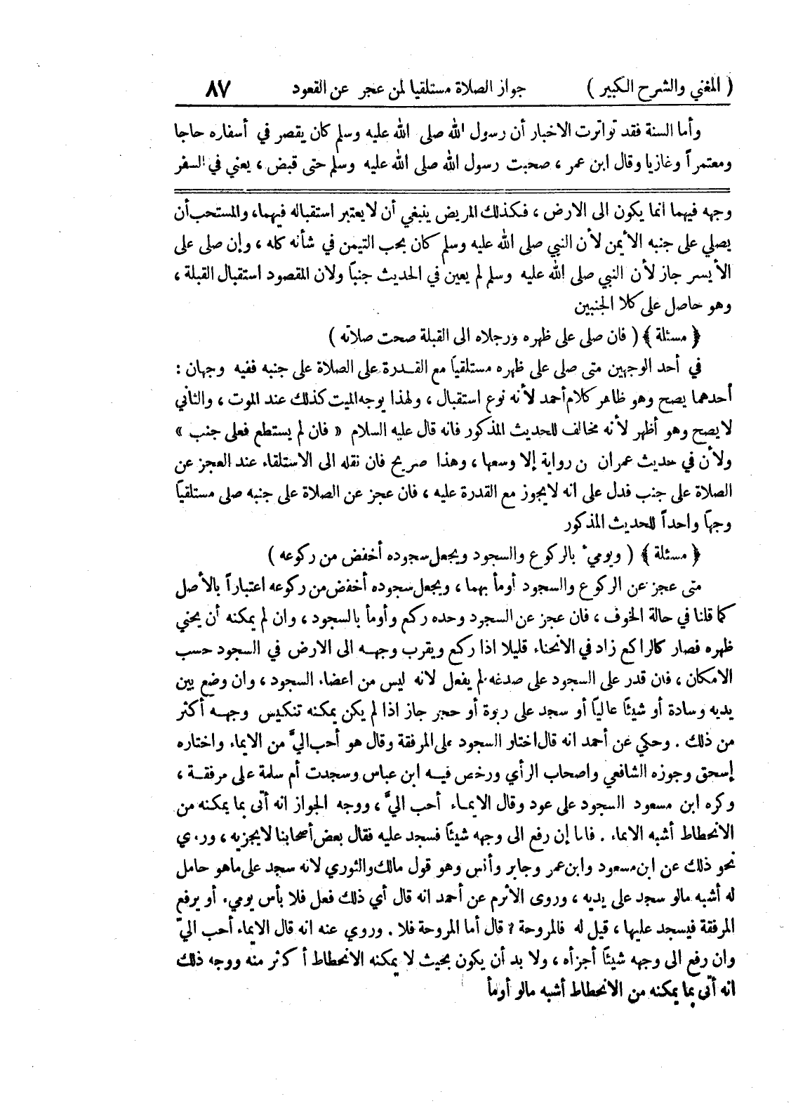 في أحد الوجهين متى صلى على ظهره مستلقياً مع القدرة على الصلاة على جنبه ففيه وجهان: أحدهما يصح وهو ظاهر كلام أحمد لأنه نوع إستقبال، ولهذا يوجه الميت كذلك عند الموت، والثاني لا يصح وهو أظهر لأنه مخالف للحديث المذكور فإنه قال عليه السلام " فإن لم يستطع فعلى جنب " ولأن في حديث عمران؟ ن رواية إلا وسعها، وهذا صريح فإن نقله إلى الاستلقاء عند العجز عن الصلاة على جنب فدل على أنه لا يجوز مع القدرة عليه، فإن عجز عن الصلاة على جنبه صلى مستلقياً وجهاً واحداً للحديث المذكور * (مسألة) * (ويومئ بالركوع والسجود ويجعل سجوده أخفض من ركوعه) متى عجز عن الركوع والسجود أومأ بهما، ويجعل سجوده أخفض من ركوعه اعتباراً بالأصل كما قلنا في حالة الخوف، فإن عجز عن السجود وحده ركع وأومأ بالسجود، وإن لم يمكنه أن يحني ظهره فصار كالراكع زاد في الانحناء قليلاً اذا ركع ويقرب وجهه الى الأرض في السجود حسب الامكان، فإن قدر على السجود على صدغه لم يفعل لأنه ليس من أعضاء السجود، وان وضع بين يديه وسادة أو شيئاً عالياً أو سجد على ربوة أو حجر جاز إذا لم يكن يمكنه تنكيس وجهه أكثر من ذلك.