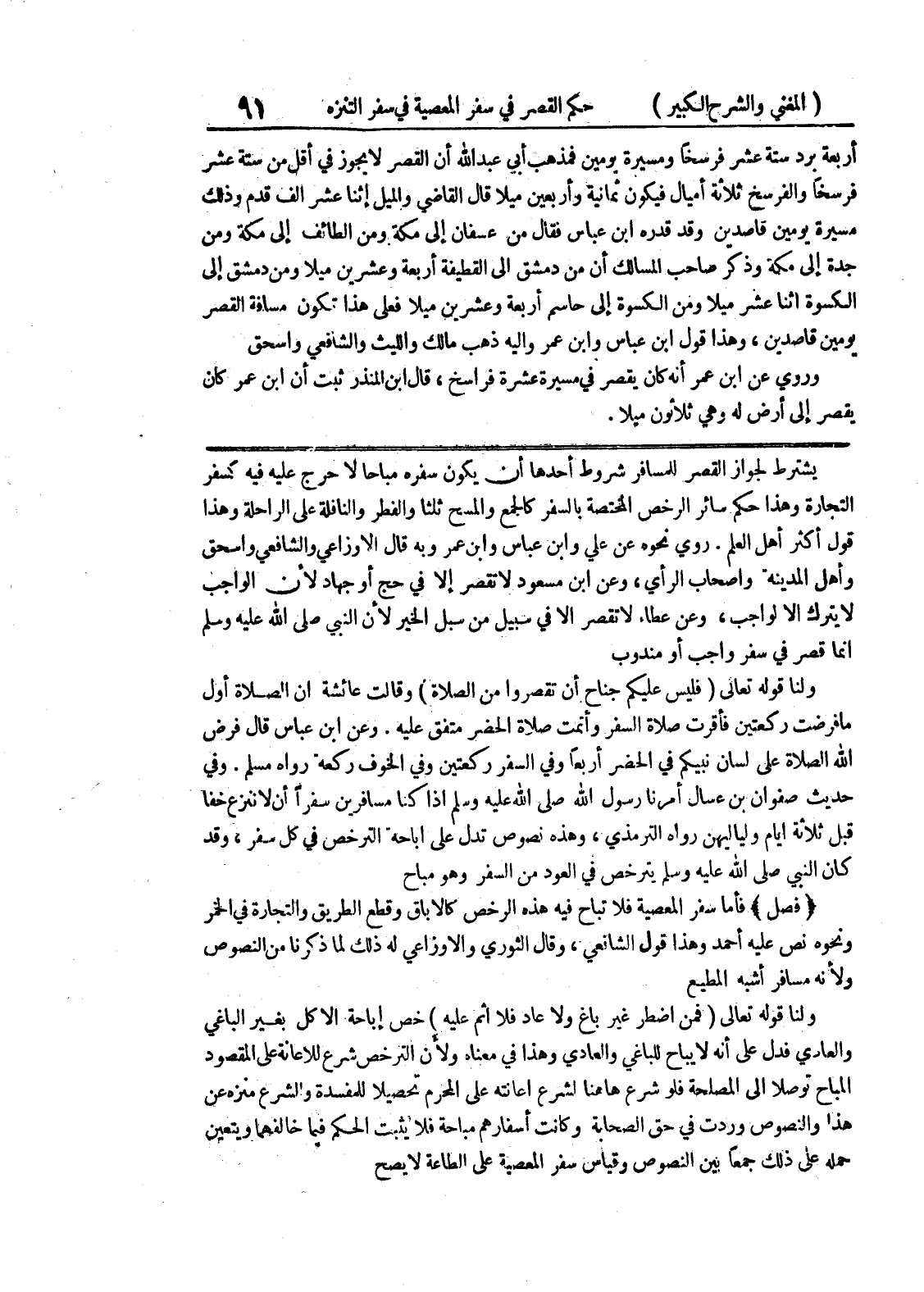 كان النبي صلى الله عليه وسلم يترخص في العود من السفر وهو مباح * (فصل) * فأما سفر المعصية فلا تباح فيه هذه الرخص كالاباق وقطع الطريق والتجارة في الخمر ونحوه نص عليه أحمد وهذا قول الشافعي، وقال الثوري والاوزاعي له ذلك لما ذكرنا من النصوص ولأنه مسافر أشبه المطيع ولنا قوله تعالى (فمن اضطر غير باغ ولا عاد فلا إثم عليه) خص إباحة الأكل بغير الباغي والعادي فدل على أنه لا يباح للباغي والعادي وهذا في معناه ولأن الترخص شرع للإعانة على المقصود المباح توصلاً الى المصلحة فلو شرع ها هنا لشرع إعانته على المحرم تحصيلاً للمفسدة والشرع منزه عن هذا والنصوص وردت في حق الصحابة وكانت أسفارهم مباحة فلا يثبت الحكم فيما خالفهما ويتعين حمله على ذلك جمعاً بين النصوص وقياس سفر المعصية على الطاعة لا يصح