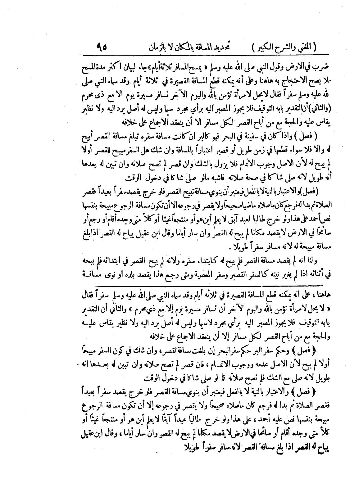 ها هنا، على أنه يمكنه قطع المسافة القصيرة في ثلاثة أيام وقد سماه النبي صلى الله عليه وسلم سفراً فقال " لا يحل لامرأة تؤمن بالله واليوم الآخر أن تسافر مسيرة يوم إلا مع ذي محرم " والثاني أن التقدير بابه التوقيف فلا يجوز المصير إليه برأي مجرد لاسيما وليس له أصل يرد اليه ولا نظير يقاس عليه والحجة مع من أباح القصر لكل مسافر إلا أن ينعقد الاجماع على خلافه * (فصل) * وحكم سفر البر حكم سفر البحر إن بلغت مسافة القصر، وان شك في كون السفر مبيحاً أو لا لم يبح لأن الأصل عدمه ووجوب الاتمام، فان قصر لم تصح صلاته وإن تبين له بعدها أنه طويل لأنه صلى مع الشك فلم تصح صلاته كما لو صلى شاكاً في دخول الوقت * (فصل) * والاعتبار بالنية لا بالفعل فيعتبر أن ينوي مسافة القصر فلو خرج يقصد سفراً بعيداً فقصر الصلاة ثم بدا له فرجع كان ما صلاه صحيحاً ولا يقصر في رجوعه إلا أن تكون مسافة الرجوع مبيحة بنفسها نص عليه أحمد، على هذا ولو خرج طالباً عبدا آبقاً لا يعلم أين هو أو منتجعاً غيثاً أو كلأ متى وجده أقام أو سائحاً في الأرض لا يقصد مكاناً لم يبح له القصر وان سار أياماً، وقال ابن عقيل يباح له القصر اذا بلغ مسافة القصر لأنه سافر سفراً طويلاً