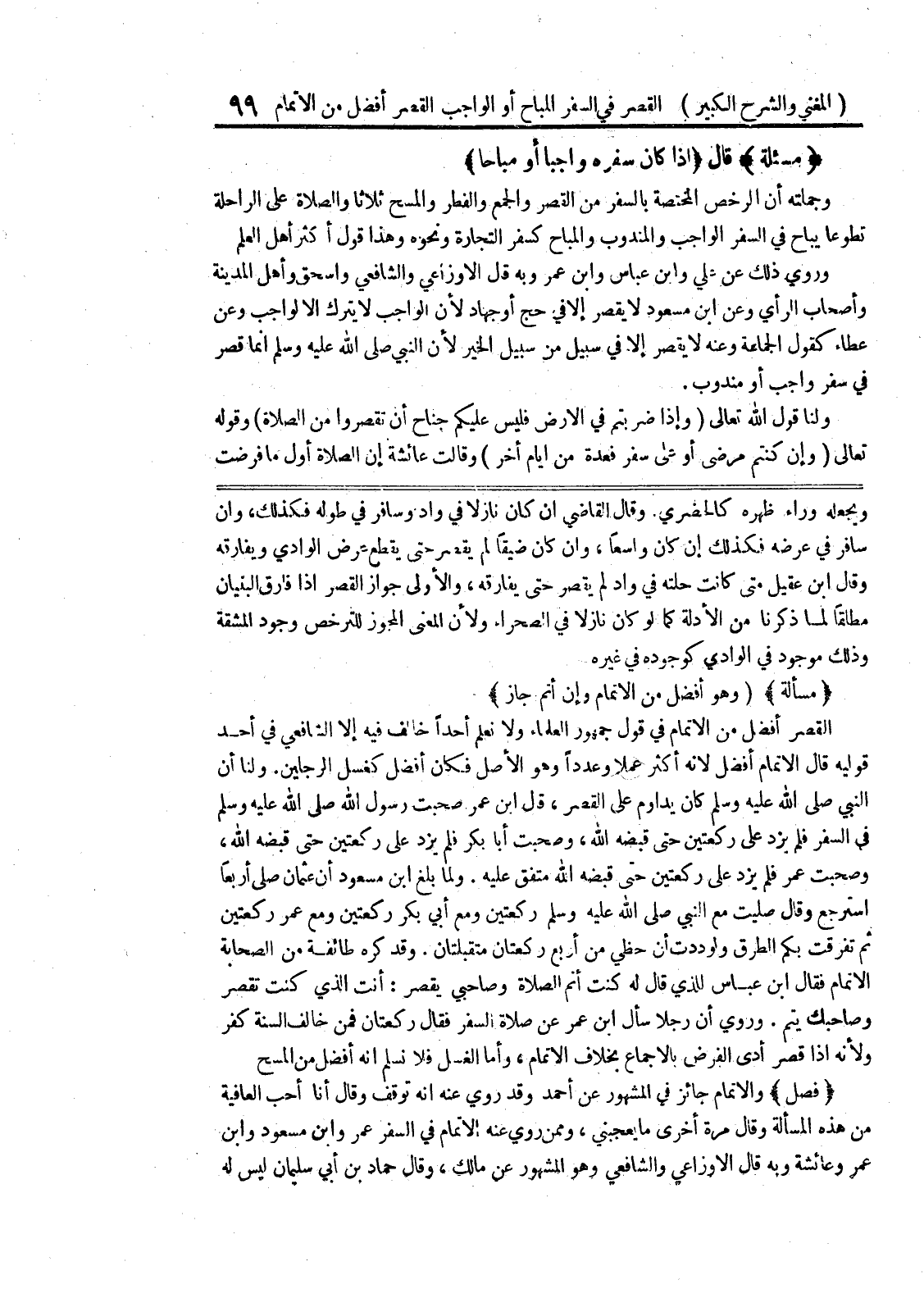 وقال القاضي إن كان نازلاً في واد وسافر في طوله فكذلك، وان سافر في عرضه فكذلك إن كن واسعاً، وان كان ضيقاً لم يقصر حتى يقطع عرض الوادي ويفارقه وقال ابن عقيل متى كانت حلته في واد لم يقصر حتى يفارقه، والأولى جواز القصر اذا فارق البنيان مطلقاً لما ذكرنا من الأدلة كما لو كان نازلاً في الصحراء ولأن المعنى المجوز للترخص وجود المشقة وذلك موجود في الوادي كوجوده في غيره * (مسألة) * (وهو أفضل من الاتمام وإن أتم جاز)
