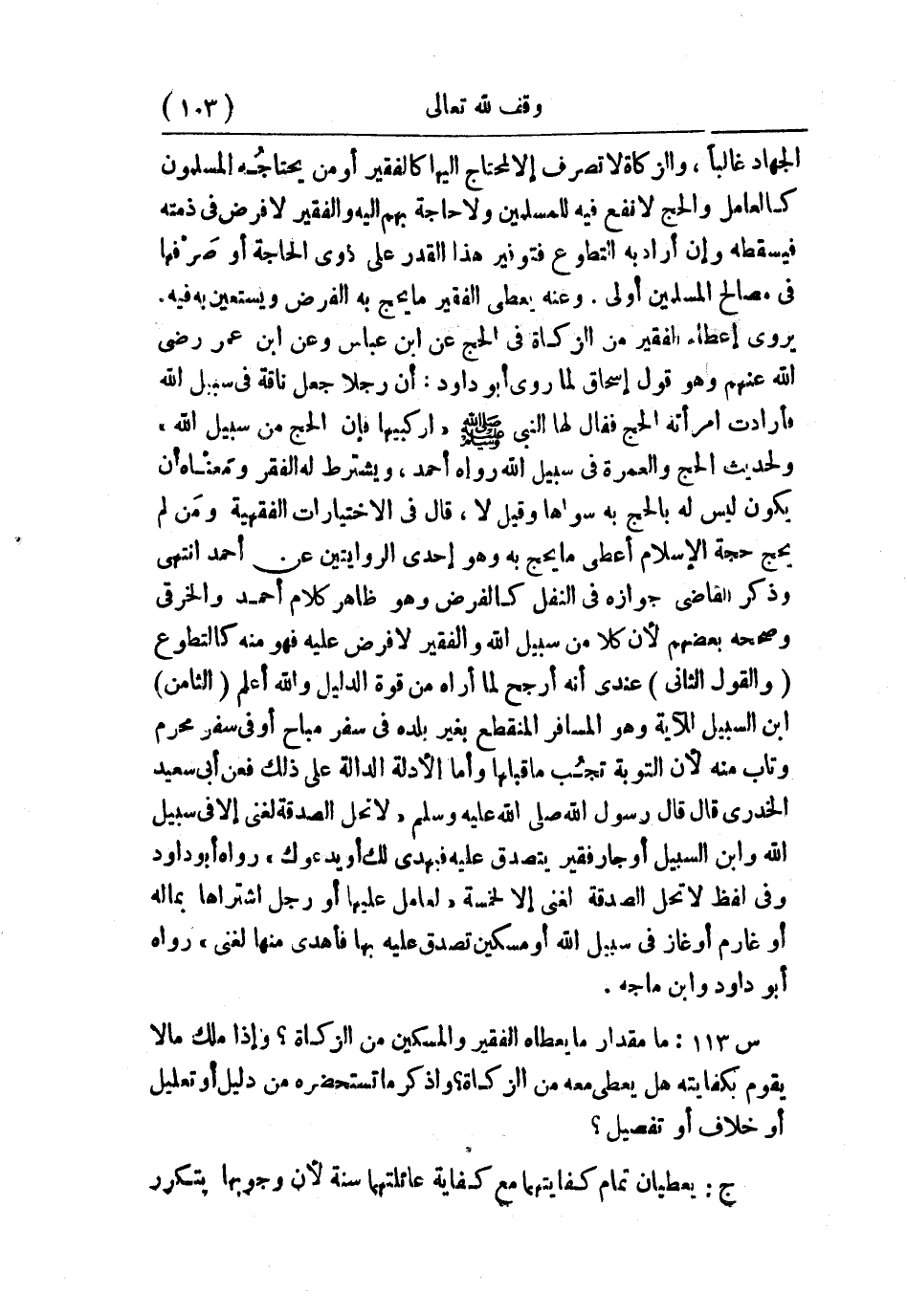 الجهاد غالبًا، والزكاة لا تصرف إلا لمحتاج إليها كالفقير أو من يحتاجُه المسلمون كالعامل والحج لا نفع فيه للمسلمين ولا حاجة بهم إليه، والفقير لا فرض في ذمته فيسقطه وإن أراد به التطوع فتوفير هذا القدر على ذوي الحاجة أو صَرفها في مصالح المسلمين أولى، وعنه يعطي الفقير ما يحج به الفرض ويستعين به فيه، يروى إعطاء الفقير من الزكاة في الحج، عن ابن عباس، وعن ابن عمر - رضي الله عنهم -، وهو قول إسحاق؛ لما روى أبو داود: أن رجلاً جعل ناقة في سبيل الله فأرادت امرأته الحج، فقال لها النبي - صلى الله عليه وسلم -: «اركبيها؛ فإن الحج من سبيل الله» ؛ ولحديث: «الحج والعمرة في سبيل الله» رواه أحمد، ويشترط له الفقر ومعنْاه أن يكون ليس له بالحج به سواها، وقيل: لا، قال في «الاختيارات الفقهية» : ومَن لم يحج حجة الإسلام أعطى ما يحج به وهو إحدى الروايتين عن أحمد، انتهى. وذكر القاضي جوازه في النفل كالفرض وهو ظاهر كلام أحمد والخرقي، وذكر القاضي جوازه في النفل كالفرض وهو ظاهر كلام أحمد والخرقي وصححه بعضهم؛ لأن كلاً من سبيل الله والفقير لا فرض عليه فهو منه كالتطوع. والقول الثاني: عندي أنه أرجح لما أراه من قوة الدليل. والله أعلم. الثامن: ابن السبيل للآية وهو المسافر المنقطع بغير بلده في سفر مباح أو في سفر محرم وتابه منه؛ لأن التوبة تجُب ما قبلها؛ وأما الأدلة الدالة على ذلك، فعن أبي سعيد الخدري قال: قال رسول الله - صلى الله عليه وسلم -: «لا تحل الصدقة لغني إلا في سبيل الله وابن السبيل أو جار فقير يتصدق عليه فبهدى لك أو يدعوك» رواه أبو داود، وفي لفظ: «لا تحل الصدقة لغني إلا لخمسة لعامل عليها، أو رجل اشتراها بماله، أو غارم، أو غاز في سبيل الله، أو مسكين تصدق عليه بها فأهدى منها لغني» رواه أبو داود وابن ماجه.