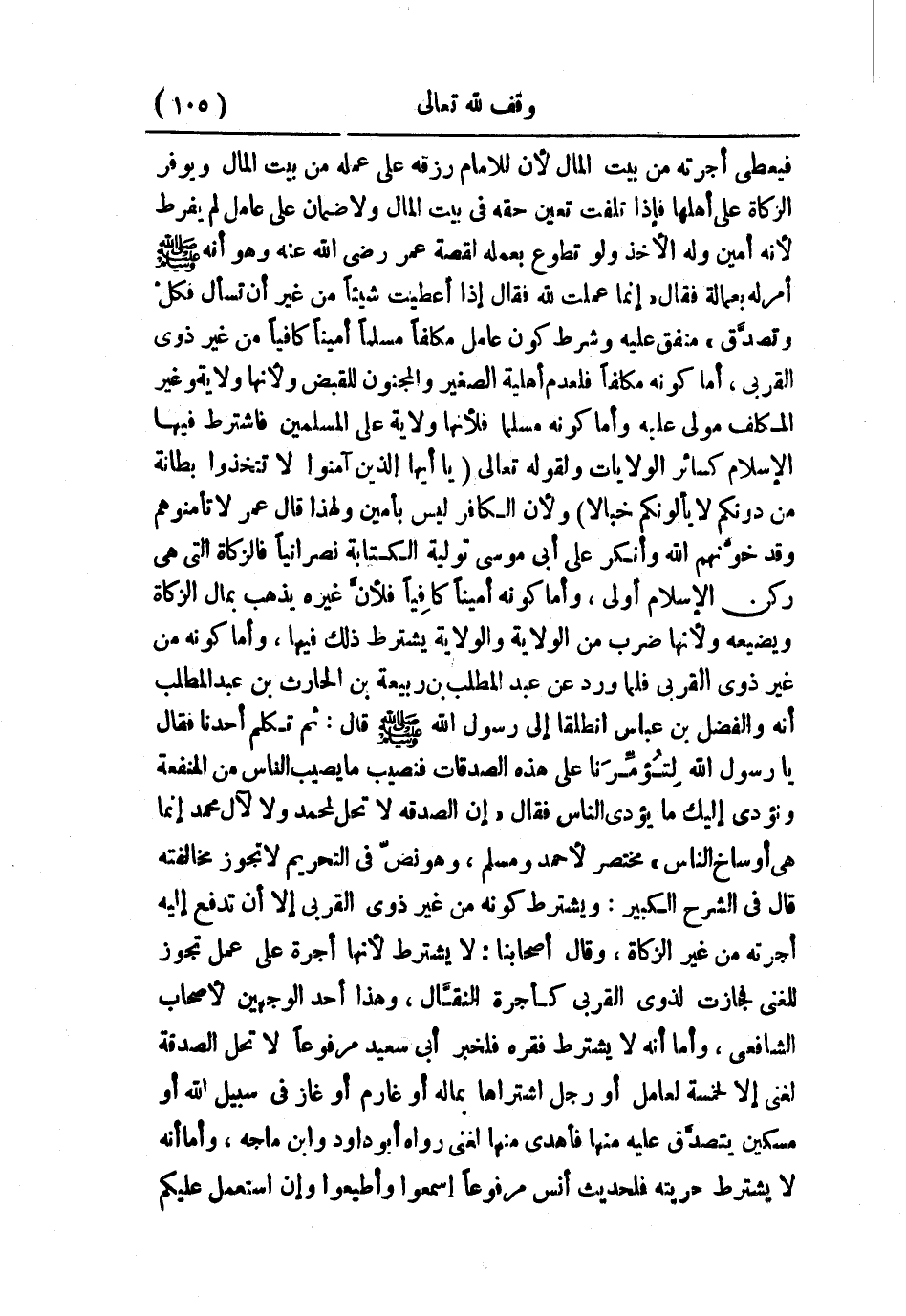 فيعطي أجرته من بيت المال؛ لأن للإمام رزقه على عمله من بيت المال ويوفر الزكاة على أهلها؛ فإذا تلفت تعين حقه في بيت المال ولا ضمان على عامل لم يفرط؛ لأنه أمين وله الأخذ ولو تطوع بعمله؛ لقصة عمر - رضي الله عنه - وهو أنه - صلى الله عليه وسلم - أمر له بعمالة، فقال: إنما عملت لله، فقال: «إذا أعطيت شيئًا من غير أن تسأل فكلْ وتصدَّق» متفق عليه. وشرط كون عامل مكلفًا مسلمًا أمينًا كافيًا من غير ذوي القربى؛ أما كونه مكلفًا فلعدم أهلية الصغير والمجنون للقبض؛ ولأنها ولاية وغير المكلف مولى عليه؛ وأما كونه مسلمًا فلأنها ولاية على المسلمين فاشترط فيها الإسلام كسائر الولايات؛ ولقوله تعالى: {يَا أَيُّهَا الَّذِينَ آمَنُوا لاَ تَتَّخِذُوا بِطَانَةً مِّن دُونِكُمْ لاَ يَأْلُونَكُمْ خَبَالاً} ولأن الكافر ليس بأمين؛ ولهذا قال عمر: لا تأمنوهم وقد خوَّنهم الله وأنكر على أبي موسى تولية الكتابة نصرانيًا فالزكاة التي هي ركن الإسلام أولى؛ وأما كونه أمينًا كِافيًا فلأن غيره يذهب بمال الزكاة ويضيعه؛ ولأنها ضرب من الولاية والولاية يشترط فيها ذلك؛ وأما كونه من غير ذوي القربى فلما ورد عن عبد المطلب بن ربيعة بن الحارث بن عبد المطلب أنه والفضل بن عباس انطلقا إلى رسول الله - صلى الله عليه وسلم -، قال: ثم تكلم أحدنا، فقال: يا رسول الله، لِتُؤمِّرَنا على هذه الصدقات فنصيب ما يصيب الناس من المنفعة وتؤدي إليك ما يؤدي الناس، فقال: «إن الصدقة لا تحل لمحمد ولا لآل محمد إنما هي أوساخ الناس» مختصر لأحمد ومسلم، وهو نصّ في التحريم لا تجوز مخالفته، قال في «الشرح الكبير» : ويشترط كونه من غير ذوي القربى إلا أن تدفع إليه أجرته من غير الزكاة، وقال أصحابنا: لا يشترط لأنها أجرة على عمل تجوز للغني، فجازت لذوي القربى كأجرة النقَّال، وهذا أحد الوجهين لأصحاب الشافعي؛ وأما أنه لا يشترط فقر، فلخبر أبي سعيد مرفوعًا: «لا تحل الصدقة لغني إلا لخمسة لعامل، أو رجل اشتراها بماله، أو غارم، أو غاز في سبيل الله، أو مسكين يتصدَّق عليه منها فأهدى منهما لغني» رواه أبو داود وابن ماجه؛ وأما أنه لا يشترط حريته؛ فلحديث أنس مرفوعًا: «اسمعوا وأطيعوا وإن استعمل عليكم