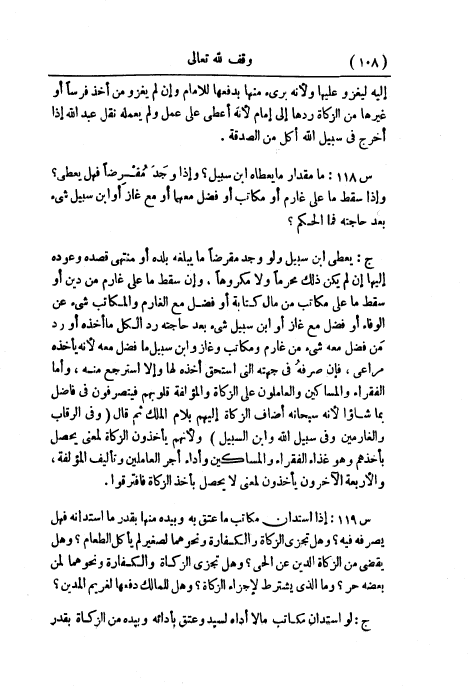 س119: إذا استدان مكاتب ما عتق به وبيده منها بقدر ما استدانه فهل يصرف فيه؟ وهل تجزي الزكاة والكفارة ونحوهما لصغير لم يأكل الطعام؟ وهل يقضي من الزكاة الدين عن الحي؟ وهل تجزي الزكاة والكفارة ونحوها لمن بعضه حر؟ وما الذي يشترط لإجزاء الزكاة؟ وهل للمالك دفعها لغريم المدين؟