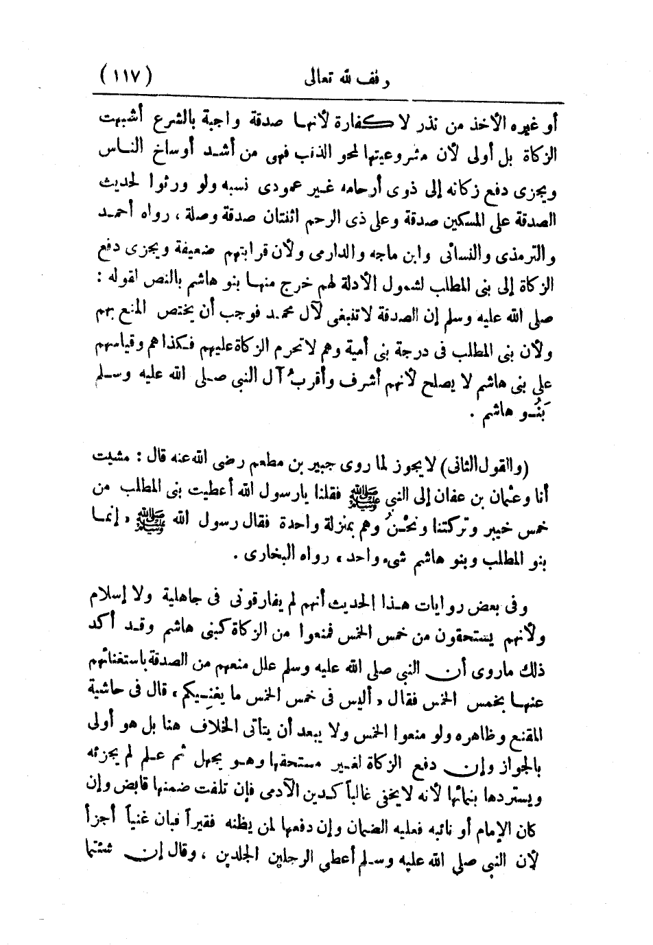 وفي بعض روايات هذا الحديث أنهم لم يفارقوني في جاهلية ولا إسلام؛ ولأنهم يستحقون من خمس الخمس فمنعوا من الزكاة كبني هاشم وقد أكد ذلك ما روى أن النبي - صلى الله عليه وسلم - علل منهم من الصدقة باستغنائهم عنها بخمس الخمس، فقال: «أليس في خمس الخمس ما يغنيكم» قال في حاشية «المقنع» : وظاهره ولو منعوا الخمس ولا يبعد أن يتأتى الخلاف هنا، بل هو أولى بالجواز وإن دفع الزكاة لغير مستحقها، وهو يجهل ثم علم لم يجزئه ويستردها بنمائها؛ لأنه لا يخفي غالبًا كدين الآدمي؛ فإن تلفت ضمنها قابض