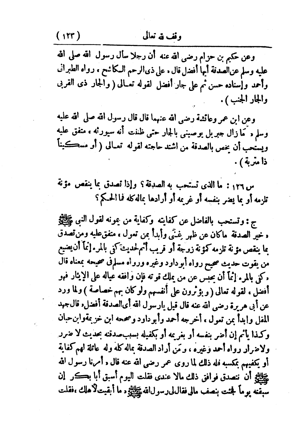 س127: ما الذي تستحب به الصدقة؟ وإذا تصدق بما ينقص مؤنة تلزمه أو بما يضر بنفسه أو غريم أو أرادها بماله كله، فما الحكم؟