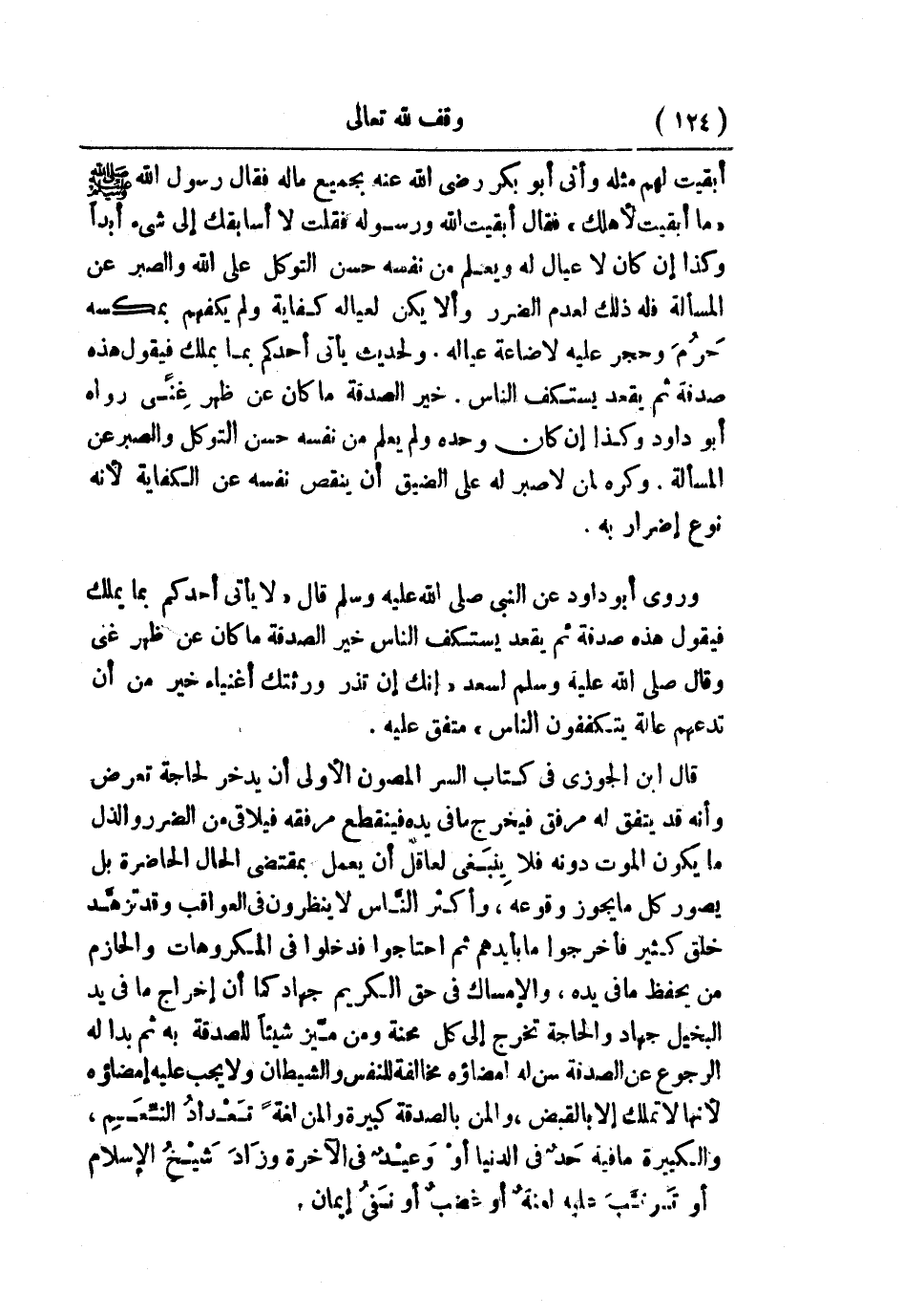 وروى أبو داود عن النبي - صلى الله عليه وسلم - قال: «لا يأتي أحدكم بما يملك، فيقول هذه صدقة، ثم يقعد يستكف الناس، خير الصدقة ما كان عن ظهر غنى» ، وقال - صلى الله عليه وسلم - لسعد: «إنك أن تذر ورثتك أغنياء خير من أن تدعهم عالة يتكففون الناس» متفق عليه.