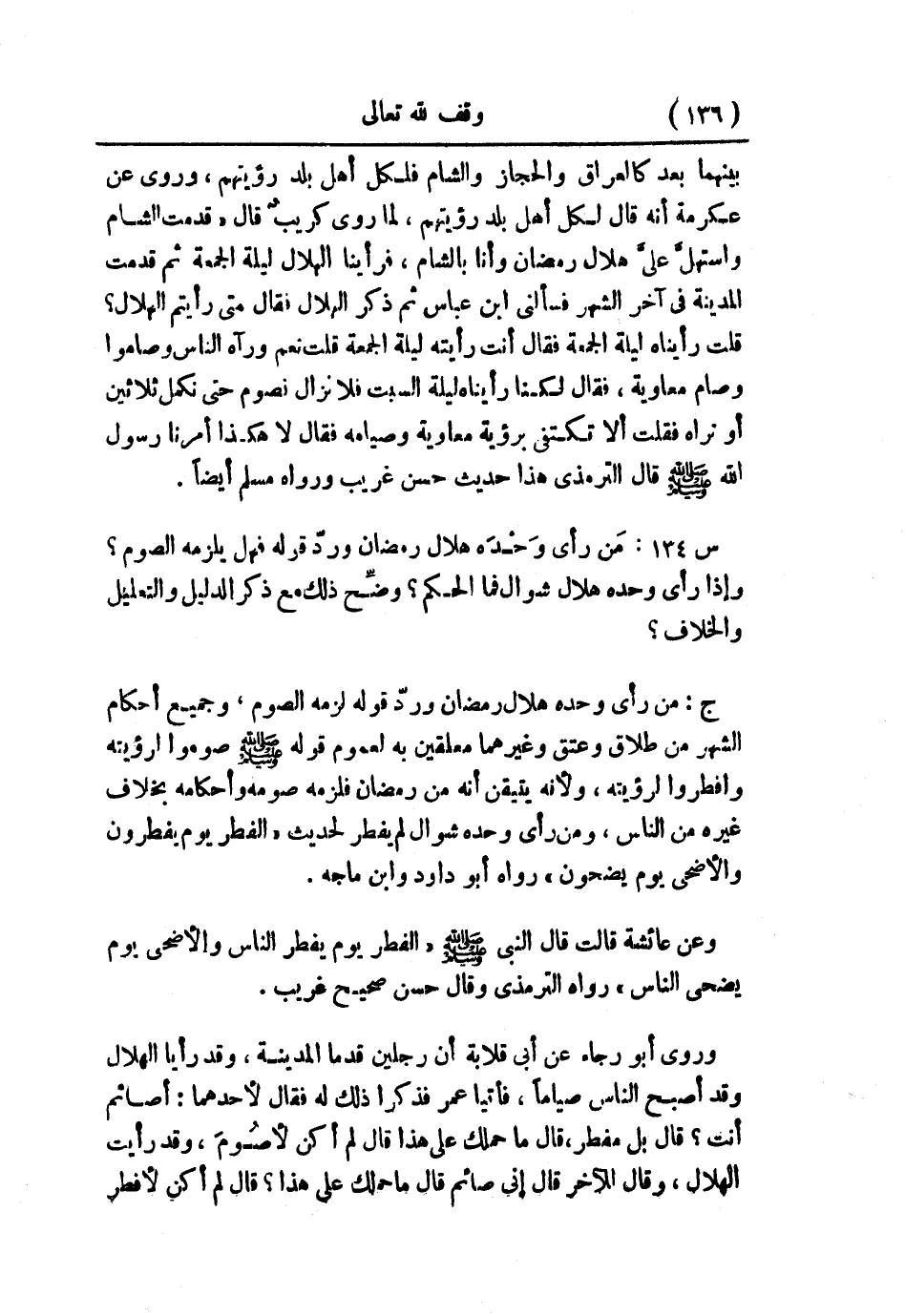قلت: رأيناه ليلة الجمعة، فقال: أنت رأيته ليلة الجمعة؟ قلت: نعم، ورآه الناس وصاموا وصام معاوية، فقال: لكنَّا رأيناه ليلة السبت، فلا نزال نصوم حتى نكمل ثلاثين أو نراه، فقلت: ألا نكتفي برؤية معاوية وصيامه، فقال: لا هكذا أمرنا رسول الله - صلى الله عليه وسلم -» . قال الترمذي: هذا حديث حسن غريب، ورواه مسلم أيضًا.