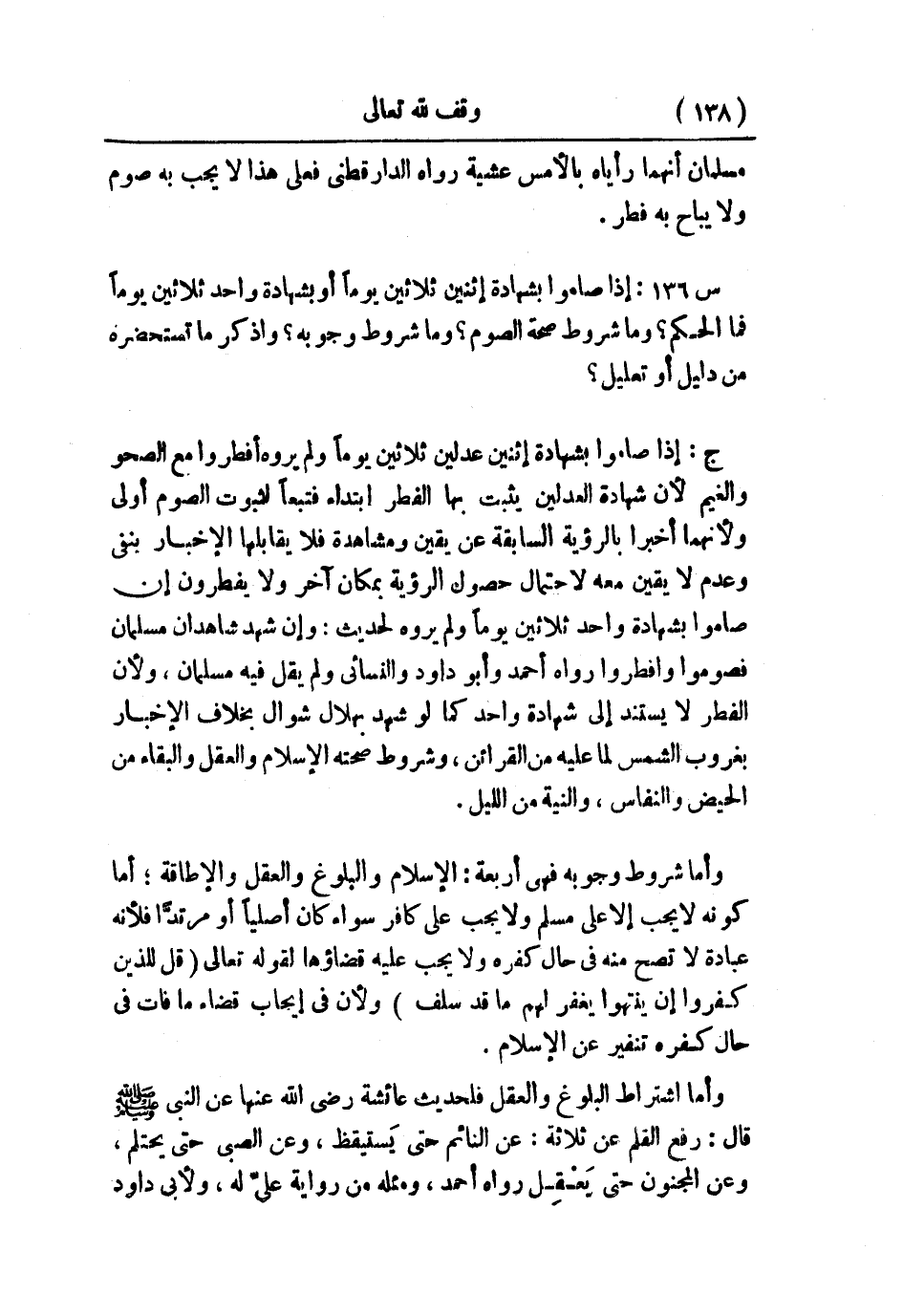 س138: إذا صاموا بشهادة إثنين ثلاثين يومًا أو بشهادة واحد ثلاثين يومًا، فما الحكم؟ وما شروط صحة الصوم؟ وما شروط وجوبه؟ واذكر ما تستحضره من دليل أو تعليل؟