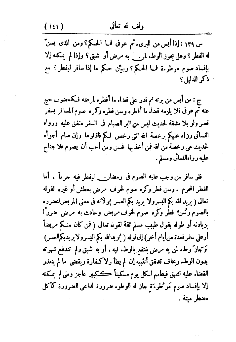 س141: إذا أيس من البريء ثم عوفي، فما الحكم؟ ومن الذي يُسنّ له الفطر؟ وهل يجوز الوطء لمن به مرض أو شبق؟ وإذا لم يمكنه إلا بإفساد صوم موطوءة، فما الحكم؟ وبيِّن حكم ما إذا سافر ليفطر؟ مع ذكر الدليل.