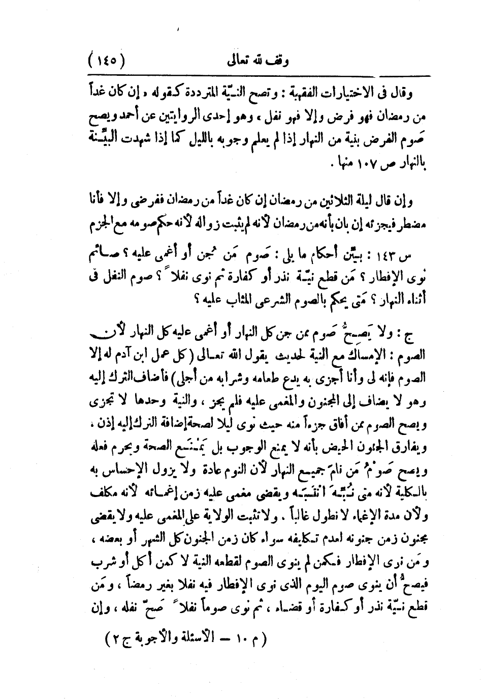 ج: ولا يَصِحُّ صَوم ممن جن كل النهار أو أغمي عليه كل النهار؛ لأن الصوم: الإمساك مع النية؛ لحديث: «يقول الله تعالى: كل عمل ابن آدم له إلا الصوم؛ فإنه لي وأنا أجزي به، يدع طعامه وشرابه من أجلي» فأضاف الترك إليه، وهو لا يضاف إلى المجنون والمغمى عليه فلم يجز، والنية وحدها لا تجزي ويصح الصوم ممن أفاق جزءًا منه حيث نوى ليلاً لصحة إضافة الترك إليه إذن. ويفارق الجنون الحيض، بأنه لا يمنع الوجوب، بل يَمْنَع الصحة ويحرم فعله ويصح صَوْمُ من نام جميع النهار؛ لأن النوم عادة ولا يزول الإحساس به بالكلية؛ لأنه متى نُبِّه انتبه ويقضي مغمى عليه زمن إغمائه؛ لأنه مكلف ولأن مدة الإغماء لا نطول غالبًا، ولا تثبت الولاية على المغمى عليه ولا يقضي مجنون زمن جنونه لعدم تكليفه سواء كان زمن الجنون كل الشهر أو بعضه، ون نوى الإفطار فكمن لم ينوي الصوم لقطعه النية لا كمن أكل أو شرب فيصح أن ينوي صوم اليوم الذي نوى الإفطار فيه نفلاً بغير رمضًا، ومن قطع نية نذر أو كفارة أو قضاء، ثم نوى صومًا نفلاً صح نفله، وإن