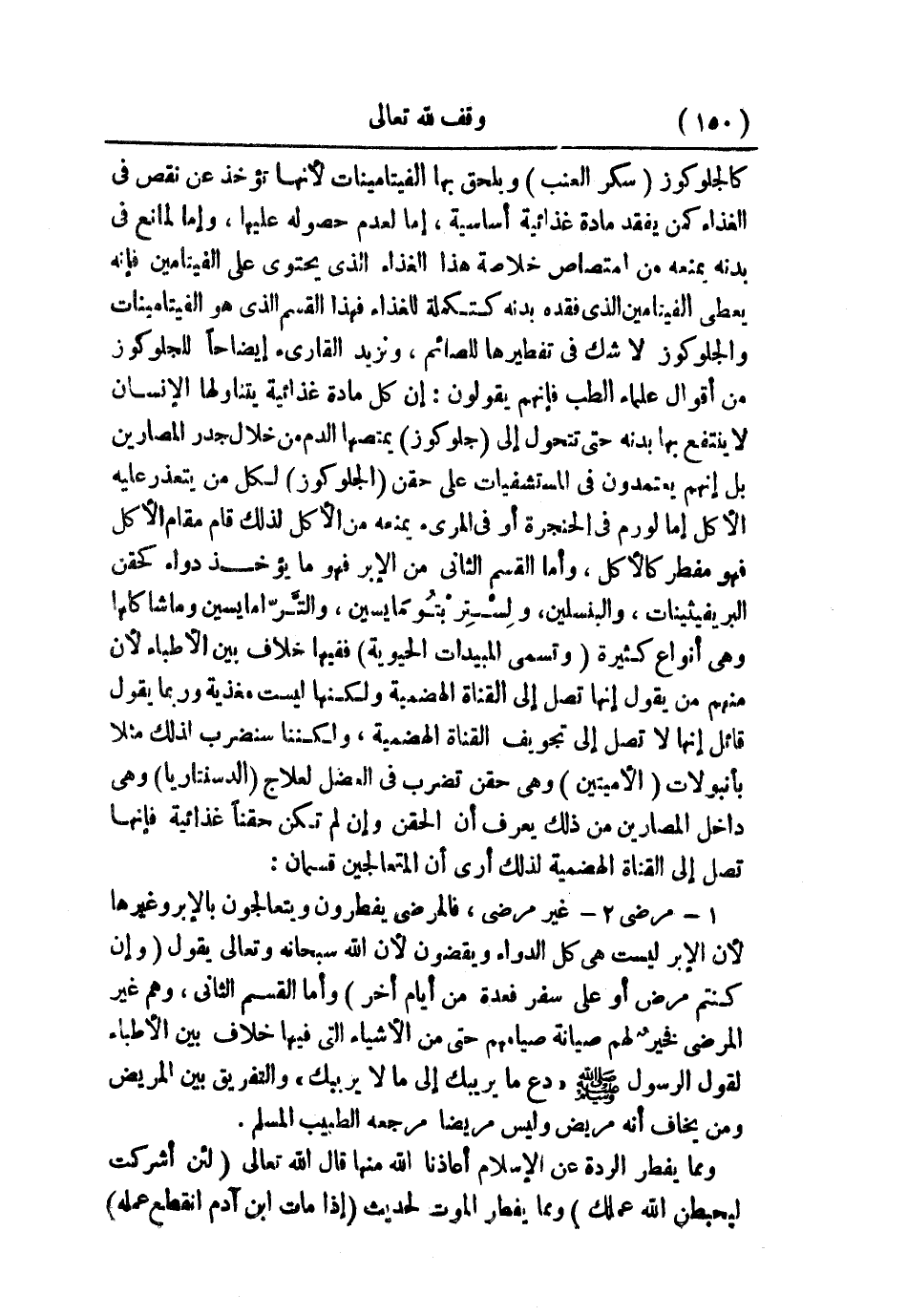 كالجلوكوز (سكر العنب) ويلحق بها الفيتامينات لأنها تؤخذ عن نقص في الغذاء كمن يفقد مادة غذائية أساسية؛ إما لعدم حصوله عليها، وإما لمانع في بدنه يمنعه من امتصاص خلاصة هذا الغذاء الذي يحتوي على الفيتامين؛ فإنه يعطي الفيتامين الذي فقده بدنه كتكملة للغذاء فهذا القسم الذي هو الفيتامينات والجلوكوز لاشك في تقطيرها للصائم، ونزيد القارئ إيضاحًا للجلوكوز من أقوال علماء الطب؛ فإنهم يقولون: إن كل مادة غذائية يتناولها الإنسان لا ينتفع بها بدنه حتى تتحول إلى جلوكوز، يمتصها الدم من خلال جدر المصارين، بل إنهم يعتمدون في المستشفيات على حقن (الجلوكوز) لكل من يتعذر عليه اأكل إما لورمن في الحنجرة أو في المريء يمنعه من الأكل لذلك قام مقام الأكل فهو مضطر كالأكل؛ وأما القسم الثاني من الإبر فهو ما يؤخذ دواء كحقن البريفيثينات، والبنسلين، ولِسْتِربتُومَايسين، والتَّرّمايسين وما شاكلها، وهي أنواع كثيرة (وتسمى المبيدات الحيوية) ففيها خلاف بين الأطباء؛ لأن منهم من يقول إنها تصل إلى القناة الهضمية ولكنها ليست مغذية، وربما يقول قائل إنها لا تصل إلى تجويف القناة الهضمية، ولكننا سنضرب لذلك مثلاً بأنبولات (الأمينين) وهي حقن تضرب في العضل لعلاج (الدسنتاريا) وهي داخل المصارين من ذلك يعرف أن الحقن وإن لم تكن حقنًا غذائية؛ فإنها تصل إلى القناة الهضمية لذلك أرى أن المتعالجين قسمان: