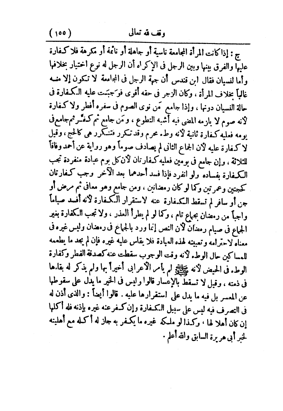 ج: إذا كانت المرأة المجامعة ناسية أو جاهلة أو نائمة أو مكرهة فلا كفارة عليها، والفرق بينها وبين الرجل في الإكراه أن الرجل له نوع اختيار بخلافها؛ وأما لنسيان، فقال ابن قندس: أن جهة الرجل في المجامعة لا تكون إلا منه غالبًا بخلاف المرأة، وكان الزجر في حقه أقوى فوجبَت عليه الكفارة في حالة النسيان دونها، إذا جامع مَن نوى الصوم في سفره أفطر ولا كفارة؛ لأنه صوم لا يلزمه المضي فيه أشبه التطوع، ومَن جامع ثم كفَّر ثم جامع في يومه فعليه كفارة ثانية؛ لأنه وطء محرم، وقد تكرر فتتكرر هي كالحج، وقيل: لا كفارة عليه؛ لأن الجماع الثاني لم يصادف صومًا وهو رواية عن أحمد وفاقًا للثلاثة، وإن جامع في يومين فعليه كفارتان؛ لأن كل يوم عبادة منفردة تجب الكفارة بفساده ولو انفرد فإذا فسد أحدهما بعد الآخر وجب كفارتان كحجتين وعمرتين وكما لو كان رمضانين، ومن جامع وهو معافى ثم مرض أو جن أو سافر لم تسقط الكفارة عنه لاستقرار الكفارة؛ لأنه أفسد صيامًا واجبًا من رمضان بجماع تام، وكما لو لم يطرأ العذر، ولا تجب الكفارة بغير الجماع في صيام رمضان؛ لأن النص إنما ورد بالجماع في رمضان وليس غيره في معناه لاحترامه وتعيينه لهذه العبادة، فلا يقاس عليه غيره؛ فإن لم يجد ما يطعمه للمساكين حال الوطء؛ لأنه وقت الوجوب سقطت عنه كصدقة الفطر وكفارة الوطء في الحيض؛ لأنه - صلى الله عليه وسلم - لم يأمر الأعرابي أخيرًا بها ولم يذكر لم بقاءها في ذمته، وقيل: لا تسقط بالإعسار، قالوا: وليس في الخير ما يدل على سقوطها عن المعسر، بل فيه ما يدل على استقرارها عليه، قالوا أيضًا: والذي أذن له في التصرف فيه ليس على سبيل الكفارة وإن كفر عنه غيره بإذنه فله أكلها إن كان أهلاً لها، وكذا لو ملكه غيره ما يكفر به جاز له أكله مع أهليته لخبر أبي هريرة السابق. والله أعلم.
