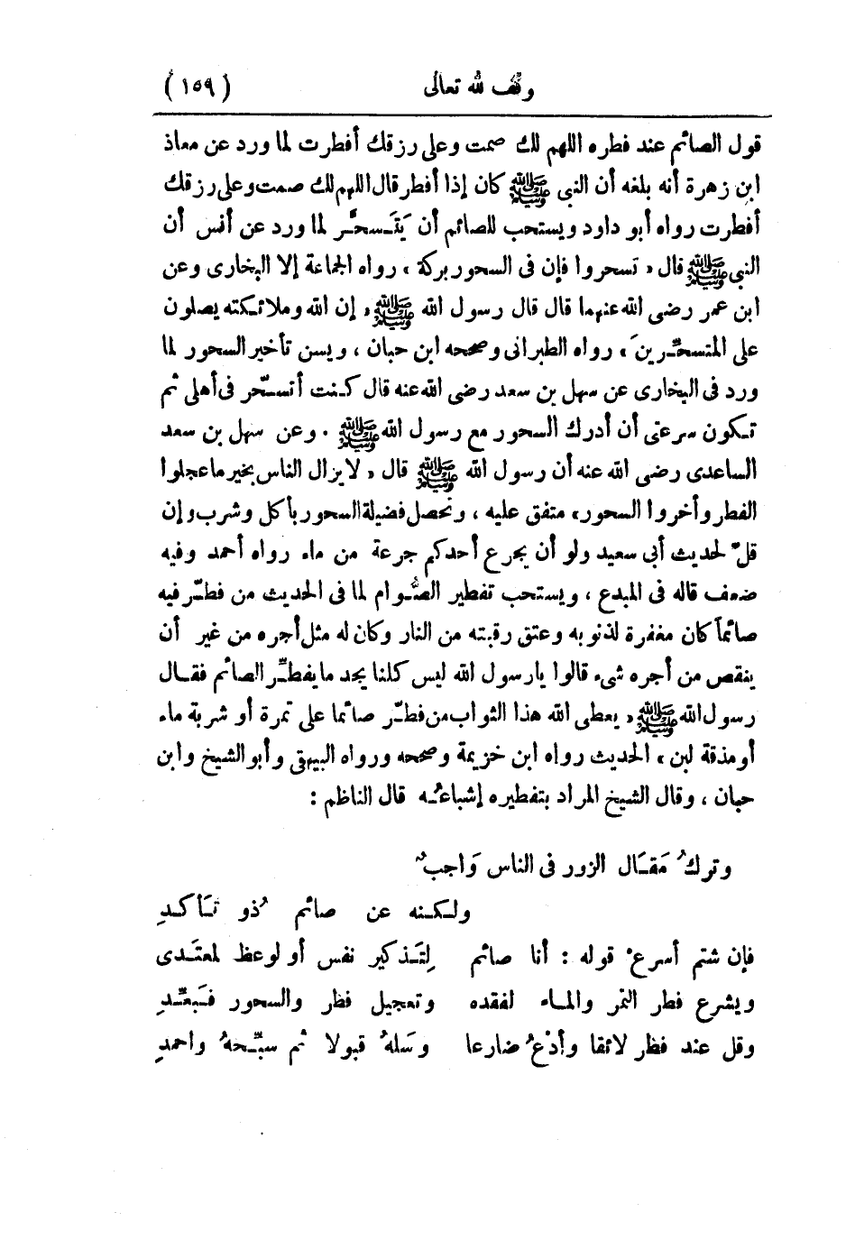 قول الصائم عند فطره: اللهم لك صمت وعلى رزقك أفطرت؛ لما ورد عن معاذ ابن زهرة أنه بلغه أن النبي - صلى الله عليه وسلم - كان إذا أفطر، قال: «اللهم لك صمت، وعلى رزقك أفطرت» رواه أبو داود، ويستحب للصائم أن يَتَسحَّر؛ لما ورد عن أنس أن النبي - صلى الله عليه وسلم - قال: «تسحروا؛ فإن السحور بركة» رواه الجماعة إلا البخاري، وعن ابن عمر -رضي الله عنهما- قال: قال رسول الله - صلى الله عليه وسلم -: «إن الله وملائكته يصلون على المتسحَّرينَ» رواه الطبراني، وصححه ابن حبان، ويُسن تأخير السحور؛ لما ورد في البخاري عن سهل بن سعد - رضي الله عنه - قال: كنت أتسحّر في أهلي ثم تكون سرعتي أن أدرك السحور مع رسول الله - صلى الله عليه وسلم -، وعن سهل بن سعد الساعدي - رضي الله عنه - أن رسول الله - صلى الله عليه وسلم - قال: «لا يزال الناس بخير ما عجلوا الفطر وأخروا السحور» متفق عليه، وتحصل فضيلة السحور بأكل وشرب، وإن قلَّ؛ لحديث أبي سعيد: «ولو أن يجرع أحدكم جرعة من ماء» رواه أحمد، وفيه ضعف، قاله في المبدع، ويستحب تفطير الصُّوام؛ لما في الحديث: «من فطّر فيه صائمًا كان مغفرة لذنوبه وعتق رقبته من النار، وكان له مثل أجره من غير أن ينقص من أجره شيء» ، قالوا: يا رسول الله، ليس كلنا يجد ما يفطِّر الصائم، فقال رسول الله - صلى الله عليه وسلم -: «يعطي الله هذا الثواب من فطّر صائمًا على تمرة أو شربة ماء أو مذقة لبن» الحديث رواه ابن خزيمة، وصححه، ورواه البيهقي وأبو الشيخ وابن حبان، وقال الشيخ: المراد بتفطيره إشباعُه، قال الناظم: