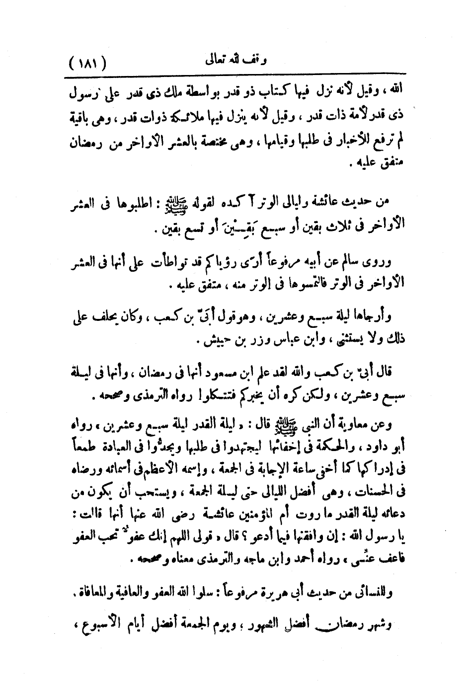 وعن معاوية أن النبي - صلى الله عليه وسلم - قال: «ليلة القدر ليلة سبع وعشرين» رواه أبو داود، والحكمة في إخفائها ليجتهدوا في طلبها ويجدُّوا في العبادة طمعًا في إدراكها كما أخفى ساعة الإجابة في الجمعة، وإسمه الأعظم في أسمائه ورضاه في الحسنات، وهي أفضل الليالي حتى ليلة الجمعة، ويستحب أن يكون من دعائه ليلة القدر ما روت أم المؤمنين عائشة - رضي الله عنها - أنها قالت: يا رسول الله، إن وافقتها فيما أدعو؟ قال: «قولي اللهم إنك عفوٌّ تحب العفو فاعف عنِّي» رواه أحمد وابن ماجه والترمذي، معناه وصححه.