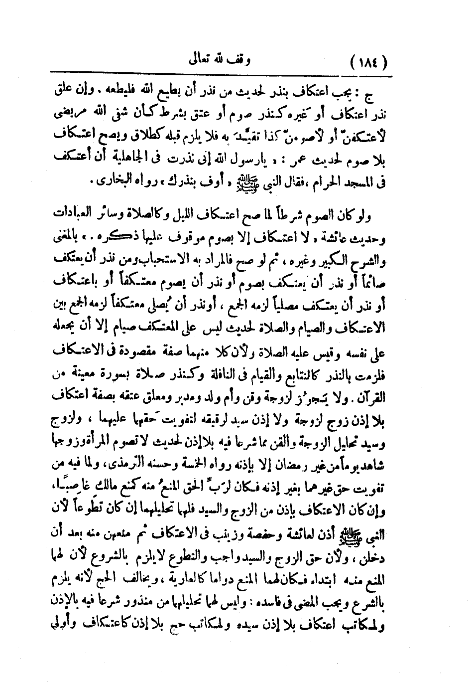 ولو كان الصوم شرطًا لما صح اعتكاف الليل وكالصلاة وسائر العبادات، وحديث عائشة: «لا اعتكاف إلا بصوم» موقوف عليها ذكره بـ «المغني» و «الشرح الكبير» وغيره، ثم لو صح فالمراد به الاستحباب، ومن نذر أن يعتكف صائمًا أو نذر أن يعتكف بصوم أو نذر أن يصوم معتكفًا أو باعتكاف أو نذر أن يعتكف مصليًا لزمه الجمع، أو نذر أن يُصلي معتكفًا لزمه الجمع بين الاعتكاف والصيام والصلاة؛ لحديث: «ليس على المعتكف صيام إلا أن يجعله على نفسه» وقيس عليه الصلاة؛ ولأن كلا منهما صفة مقصودة في الاعتكاف فلزمت بالنذر كالتتابع والقيام في النافلة، وكنذر صلاة بسورة معينة من القرآن، ولا يجوُز لزوجة وقن وأم ولد ومدبر ومعلق عتقه بصفة اعتكاف بلا إذن زوج لزوجة، ولا إذن سيد لرقيقه لتفويت حقهما عليهما، ولزوج وسيد تحليل الزوجة، والقن مما شرعا فيه بلا إذن؛ لحديث: «لا تصوم المرأة وزوجها شاهد يومًا من غير رمضان إلا بإذنه» رواه الخمسة وحسنه الترمذي؛ ولما فيه من تفويت حق غيرهما بغير إذنه فكان لربِّ الحق المنعُ منه كمنع مالك غاصِبًا، وإن كان الاعتكاف بإذن من الزوج والسيد فلهما تحليلهما إن كان تطوعًا؛ لأن النبي - صلى الله عليه وسلم - أذن لعائشة وحفصة وزينب في الاعتكاف، ثم منعهن منه بعد أن دخلن؛ ولأن حق الزوج والسيد واجب والتطوع لا يلزم بالشروع؛ لأن لهما المنع منه ابتداء فكان لهما المنع دوامًا كالعارية، ويخالف الحج؛ لأنه يلزم بالشرع ويجب المضي في فاسده، وليس لهما تحليلهما من منذور شرعًا فيه بالإذن ولمكاتب اعتكاف بلا إذن سيده ولمكاتب حج بلا إذن كاعتكاف وأولى